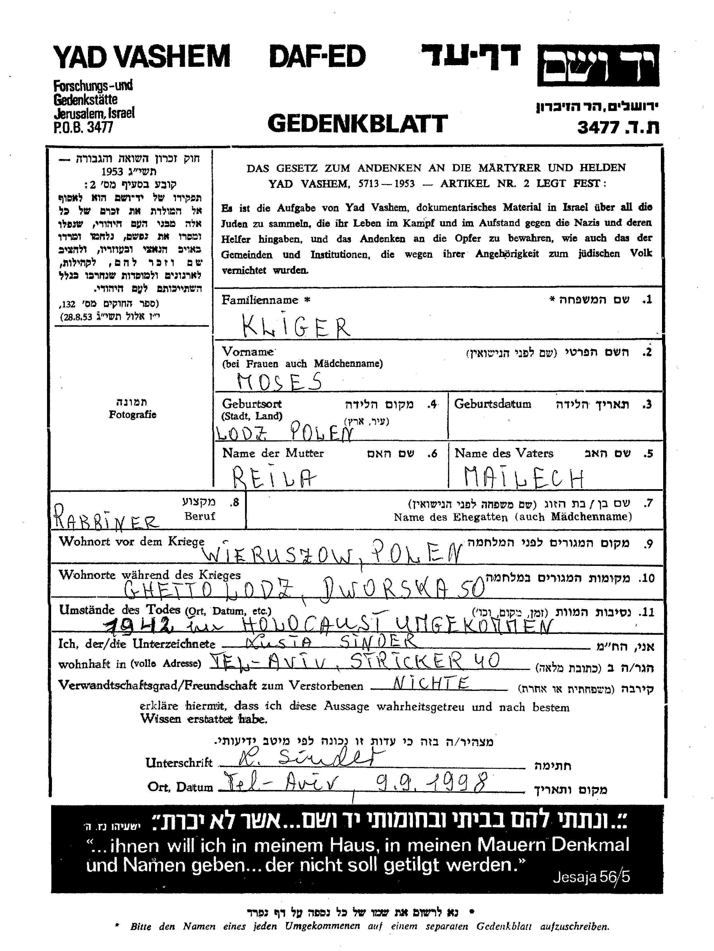 Kliger Moses Wieruszow, Pologne Feuille de témoignage