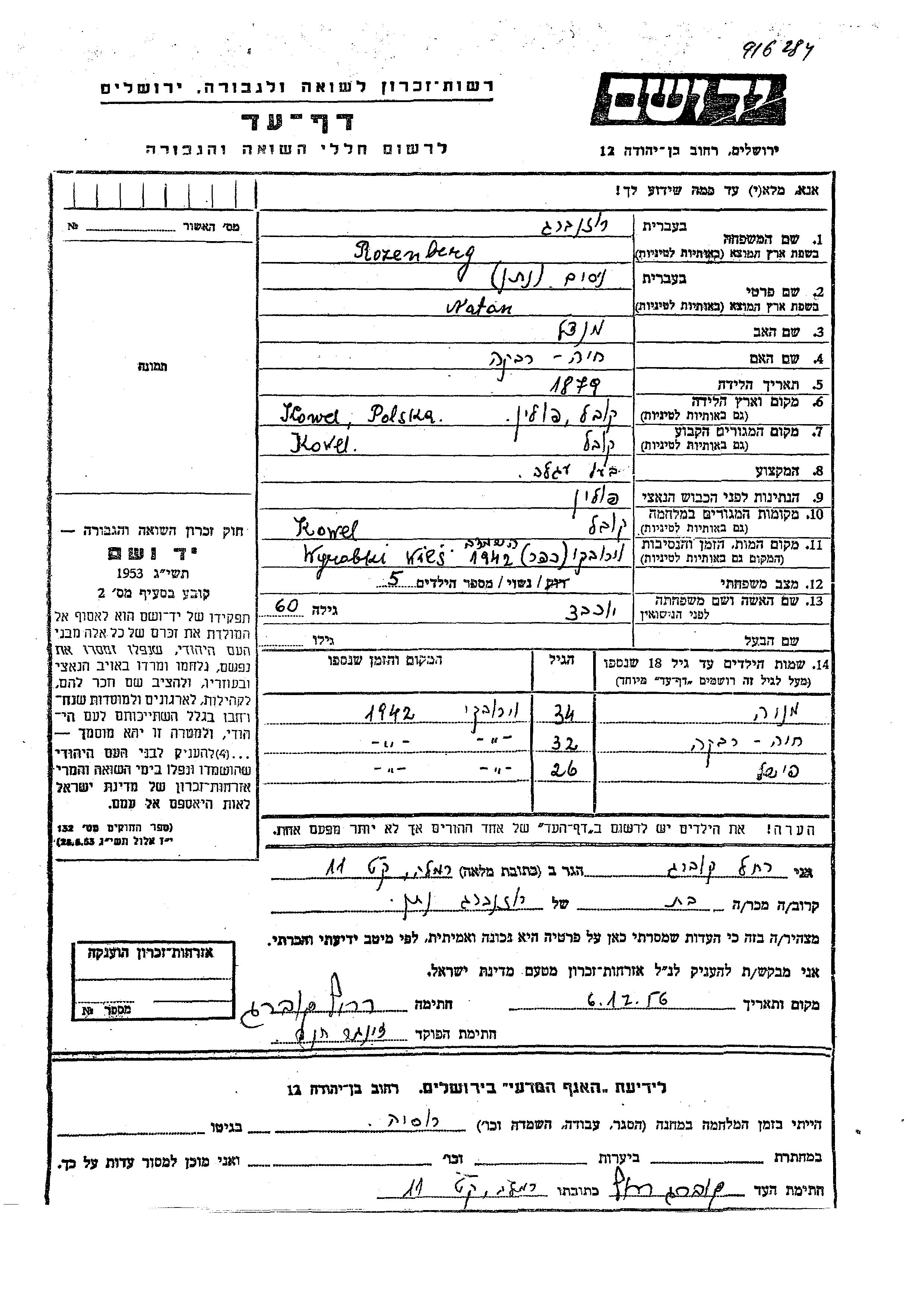 Rozenberg Nisim Natan 1879 Kowel, Pologne Feuille de témoignage
