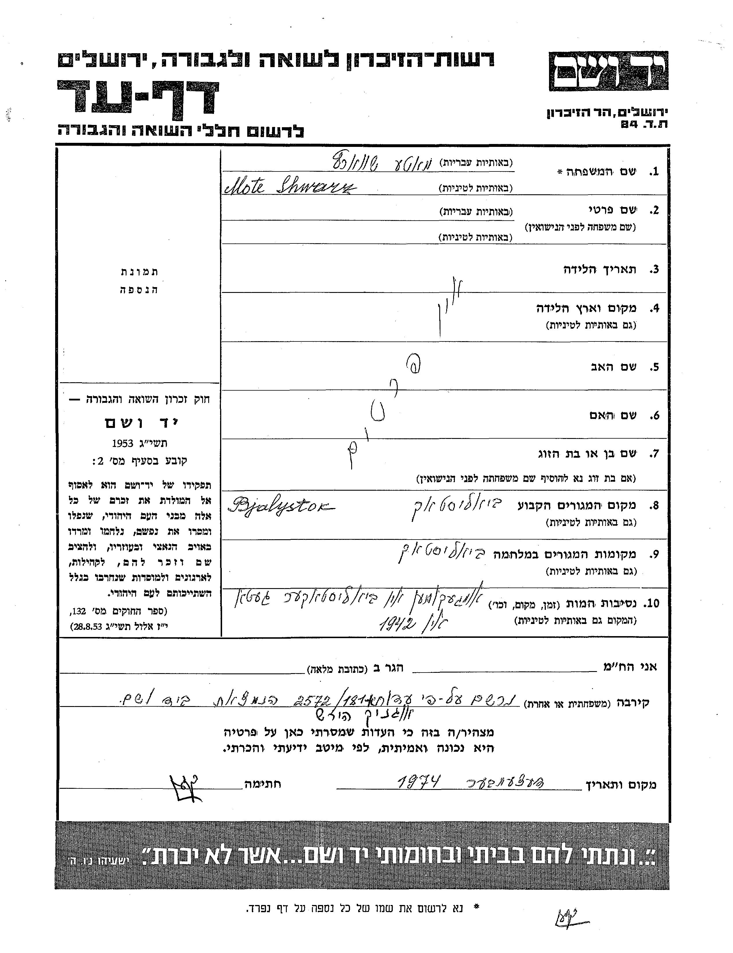 Mote Shwarz. Avant la seconde guerre mondiale il vivait à Bialystok, Pologne. Au cours de la guerre, il était à Bialystok, Pologne.