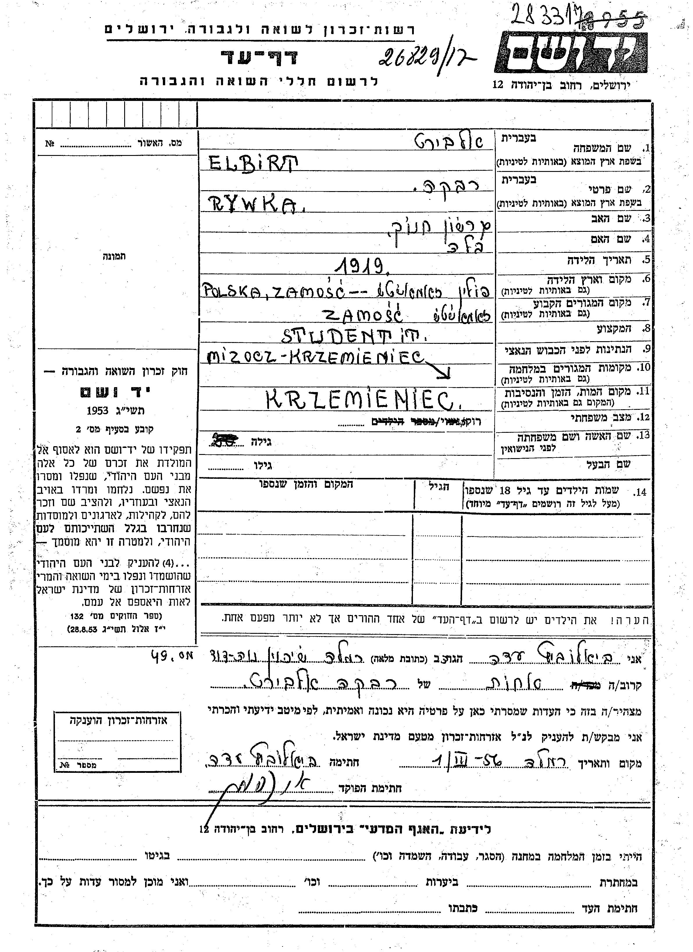 Elbirt Rywka 1919 Zamosc, Pologne Feuille de témoignage