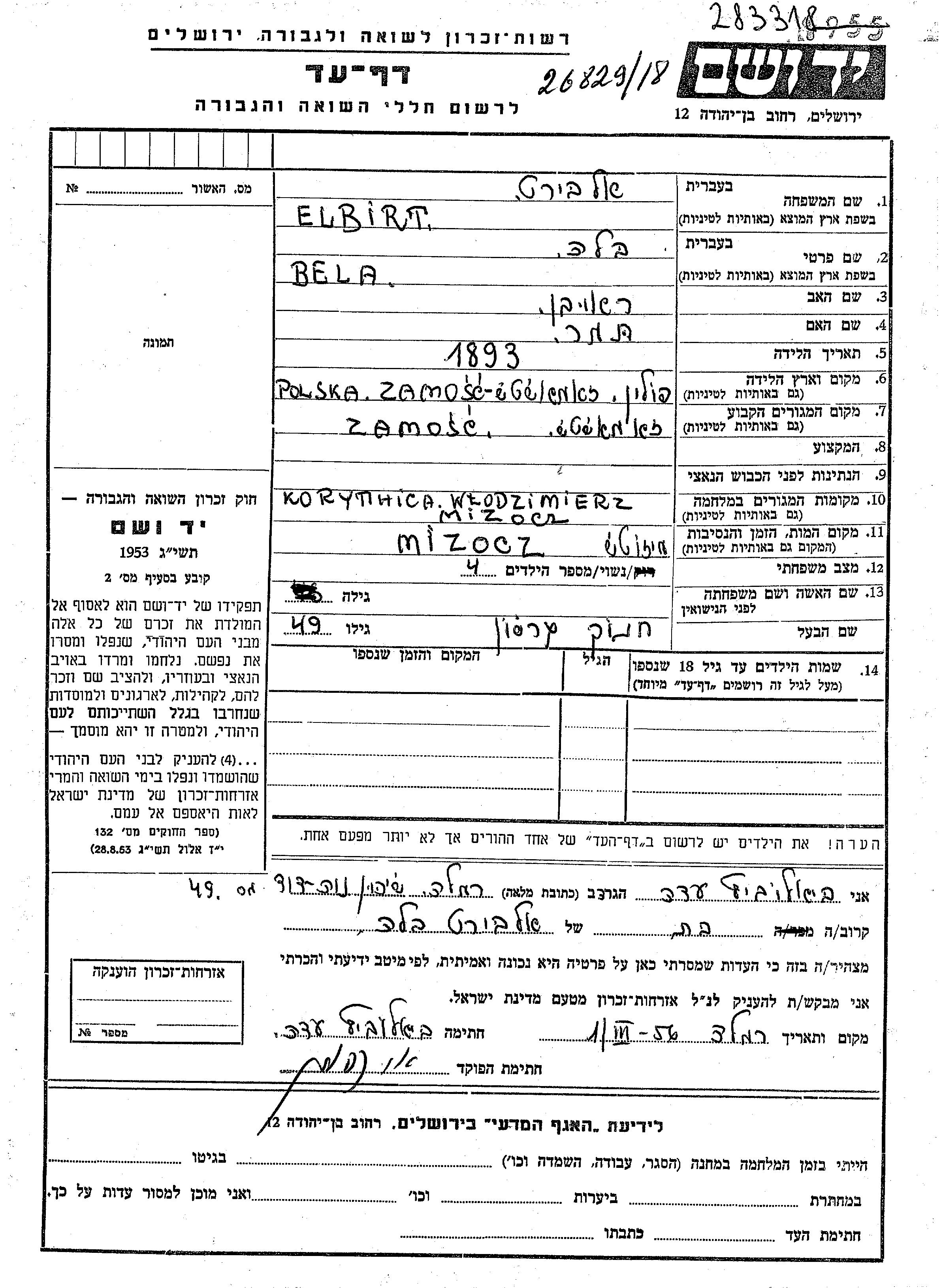 Elbirt Bela 1893 Zamosc, Pologne Feuille de témoignage