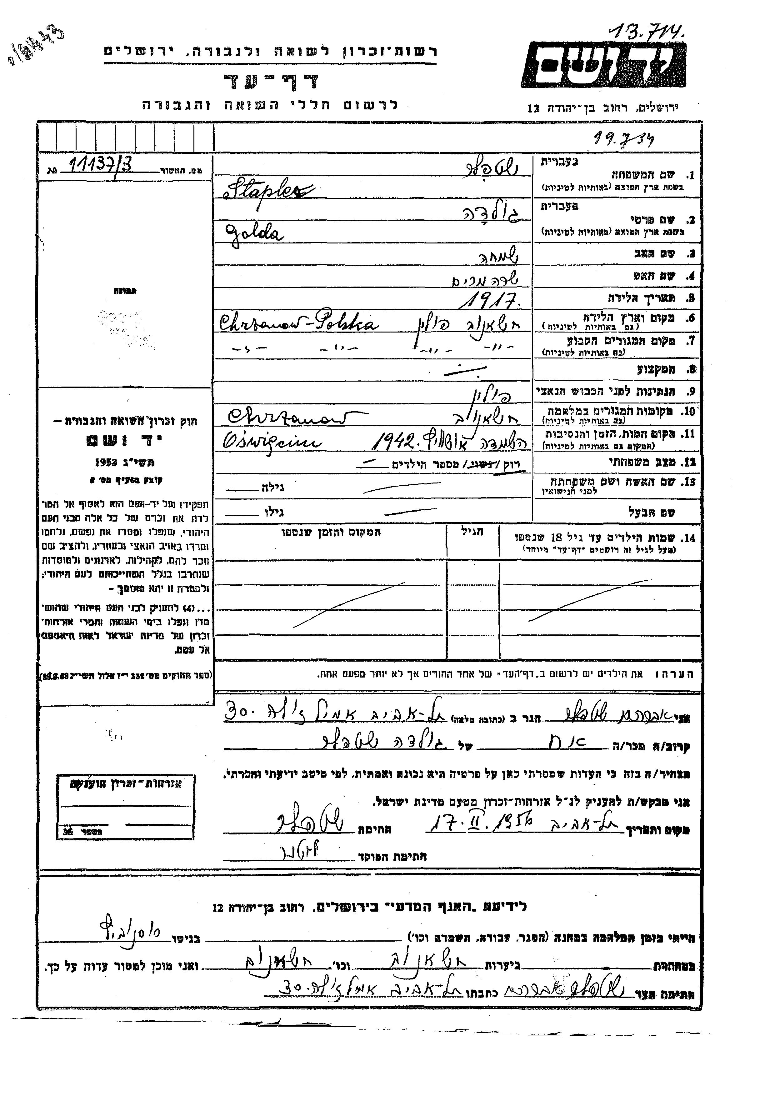 Golda Stapler est née à Chrzanow, Pologne en 1917, fille de Simkha et de Sara Miriam. Elle était Célibataire. Avant la seconde guerre mondiale elle vivait à Chrzanow, Pologne. Pendant la guerre, elle était à Chrzanow, Pologne.