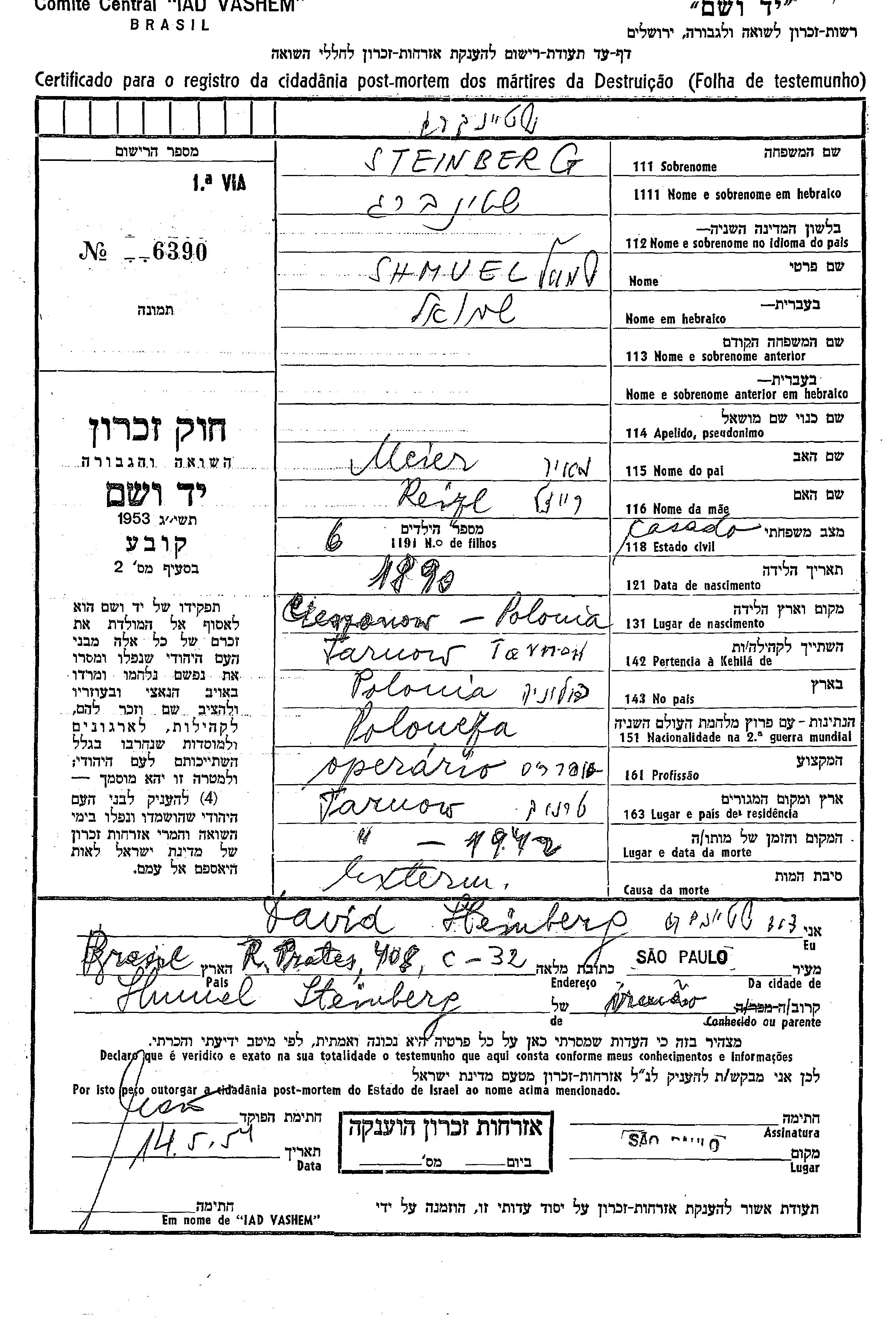 Shmuel Steinberg est né à Czestchow, Pologne en 1890, fils de Meir et de Reizl. Il était Marié. Avant la seconde guerre mondiale il vivait à Tarnow, Pologne. Au cours de la guerre, il était à Pologne.