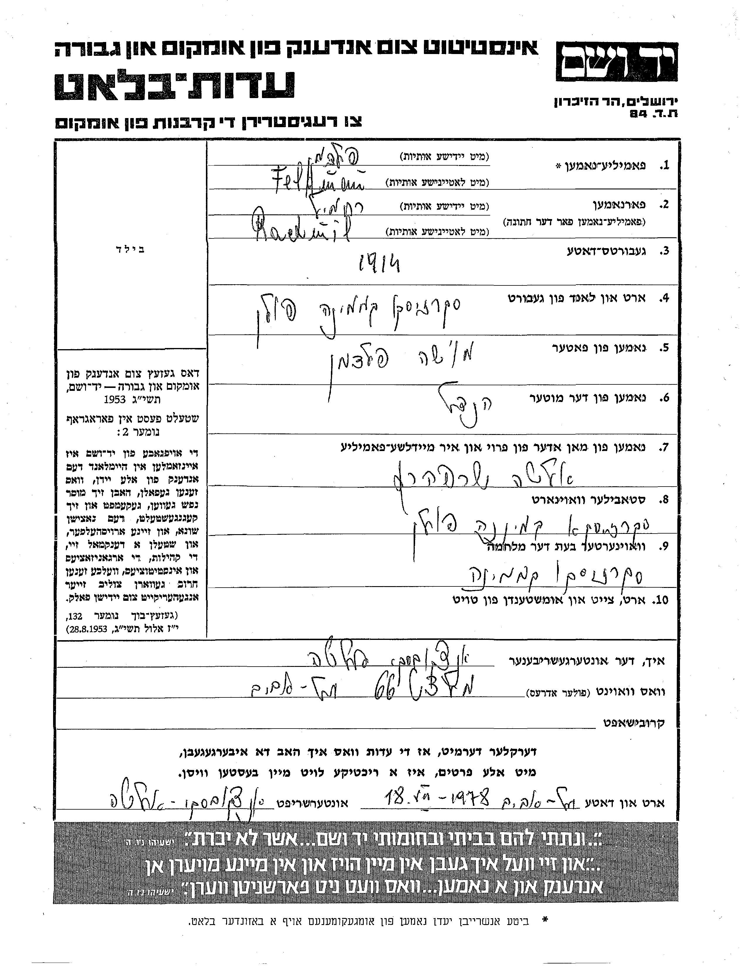 Feldman Rachmil 1914 Skarzysko Kamienna, Pologne Feuille de témoignage
