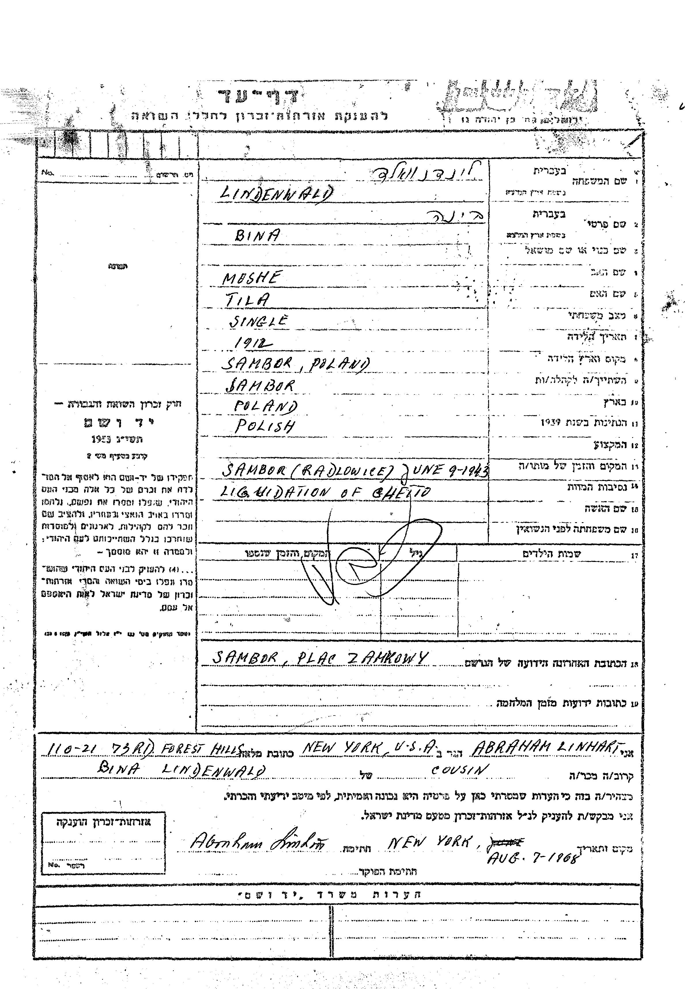 Bina Lindenwald est née à Sambor, Pologne en 1912, fille de Moshe et de Tila. Elle était Célibataire. Avant la seconde guerre mondiale elle vivait à Sambor, Pologne. Pendant la guerre, elle était à Pologne.