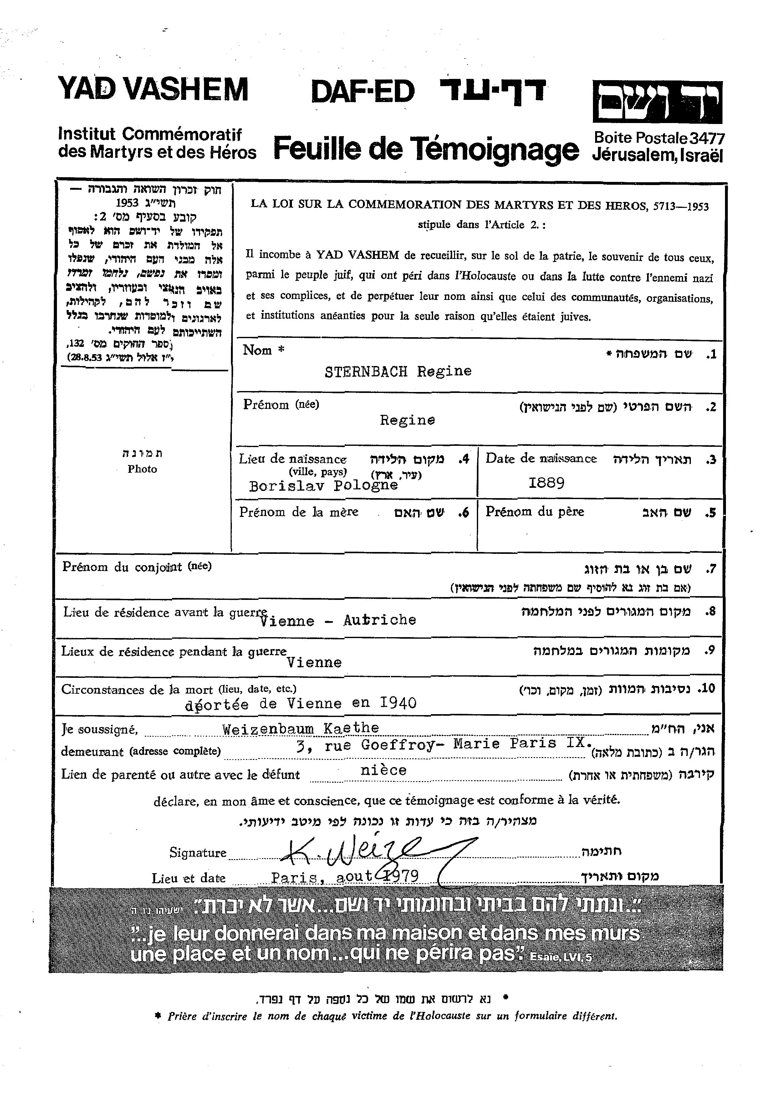 Sternbach Regine 1889 Vienna, Autriche Feuille de témoignage