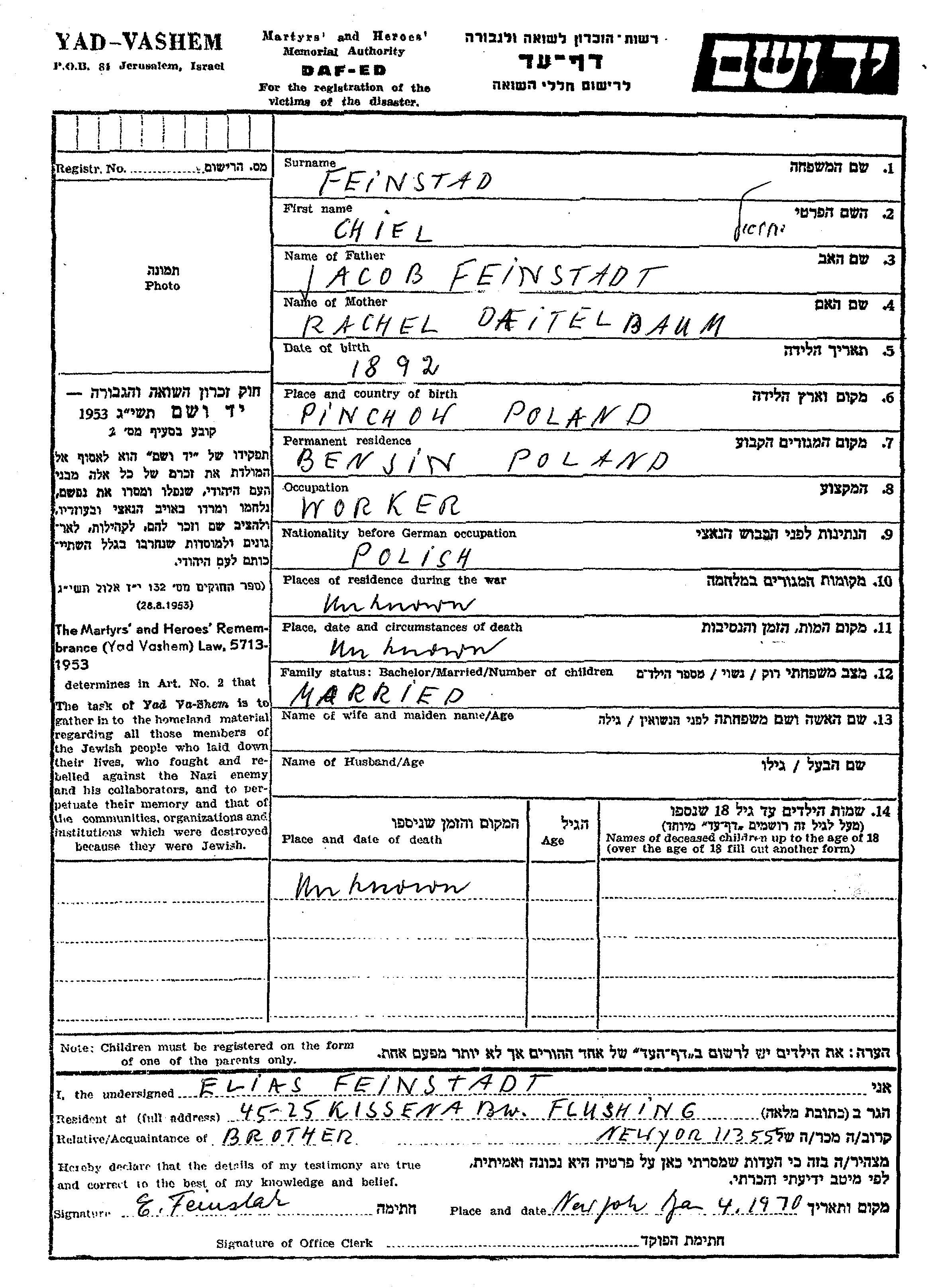 Chiel Feinstadt est né à Pincecz, Pologne en 1892, fils de Jacob et de Rachel. Il était Ouvrier/e et Marié. Avant la seconde guerre mondiale il vivait à Benjin, Pologne.