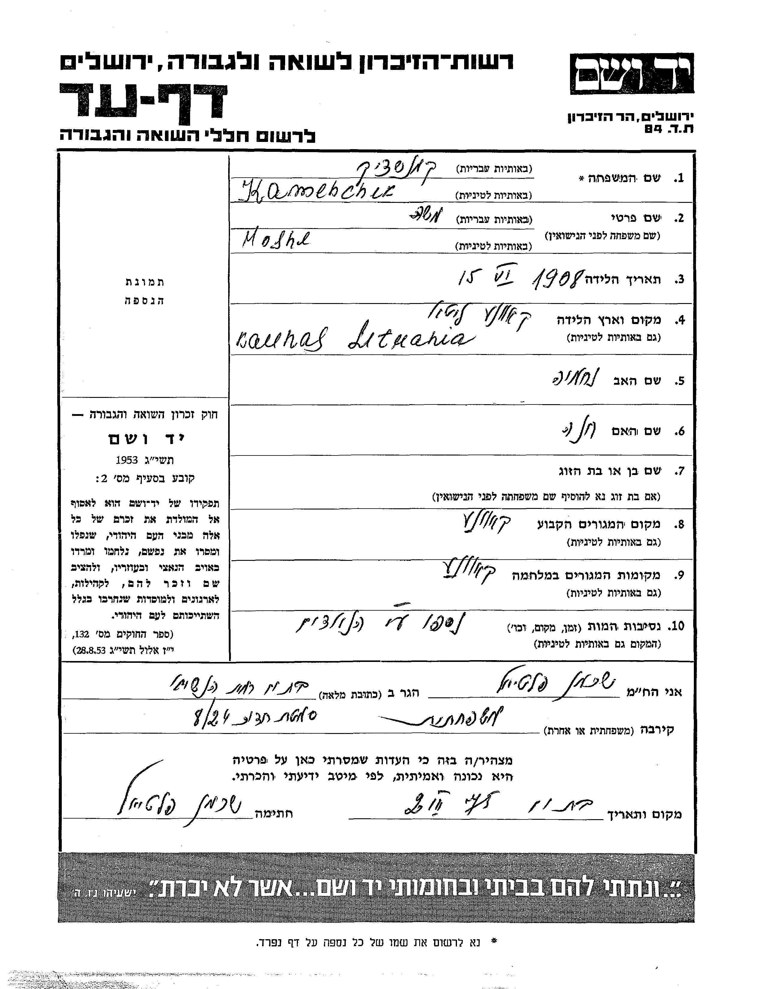 Kamenchik Moshe 1908 Kaunas, Lituanie Feuille de témoignage