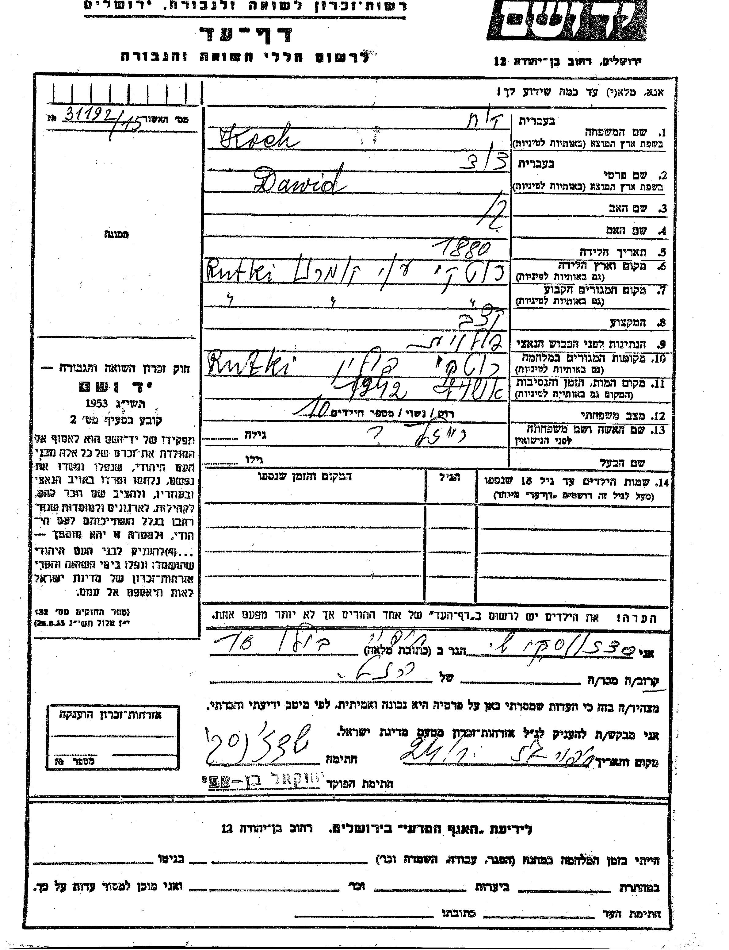 Koch Dawid 1880 Rutki, Pologne Feuille de témoignage