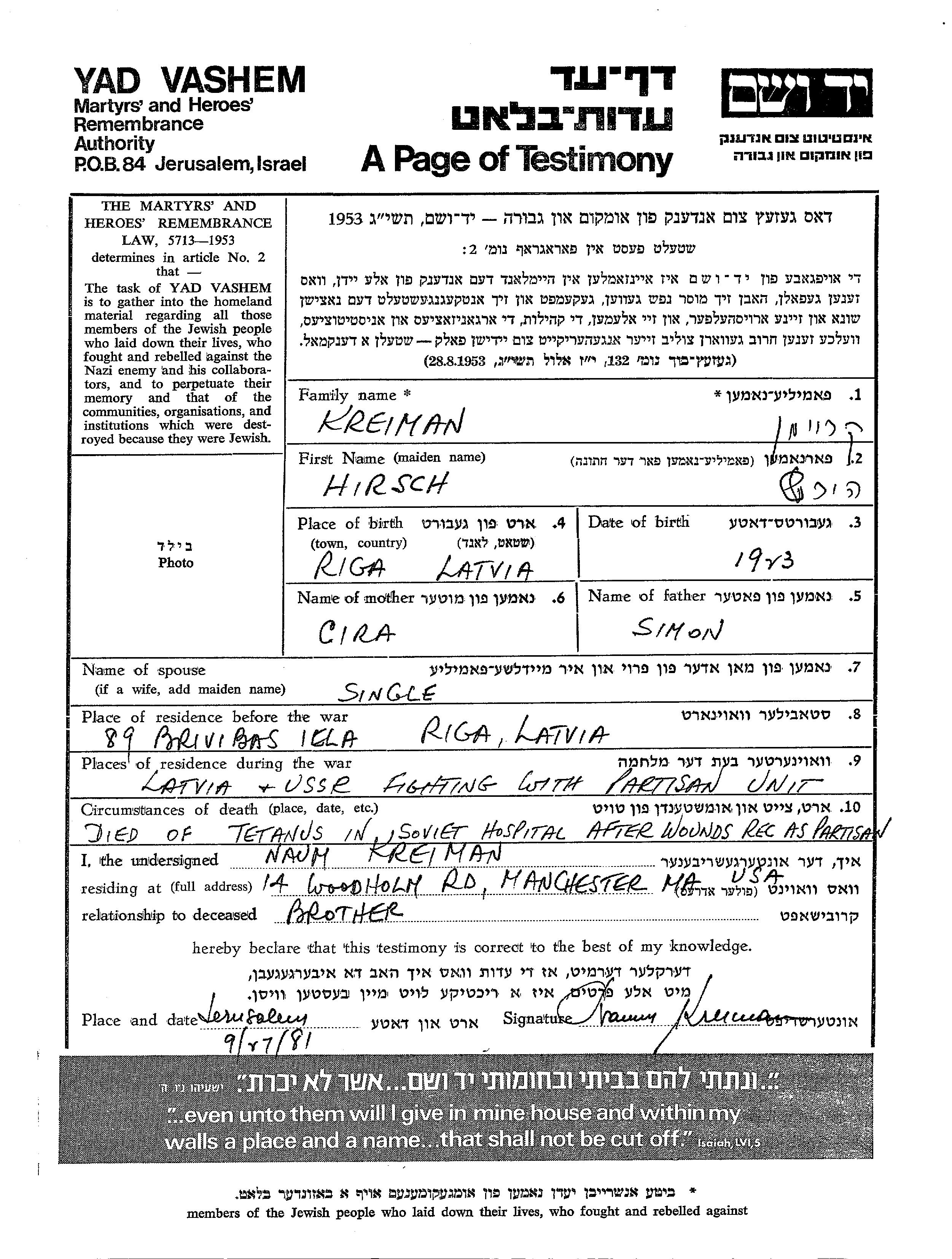 Hirsch Kreiman est né à Riga, Lettonie en 1923, fils de Simon et de Cira. Il était Célibataire. Avant la seconde guerre mondiale il vivait à Riga, Lettonie. Au cours de la guerre, il était à Lettonie.
