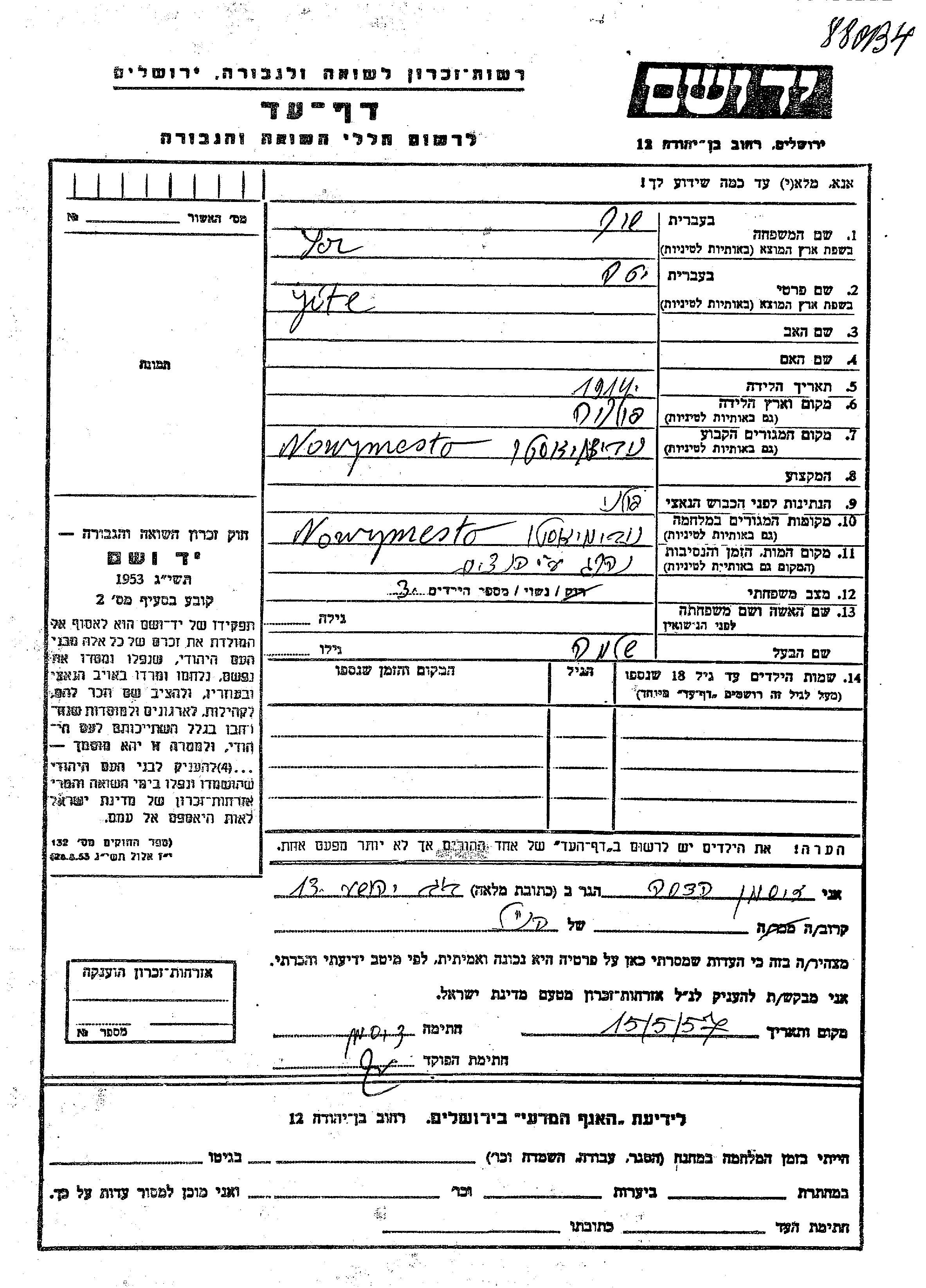 Sor Shur Yite 1914 Nowo Miasto, Pologne Feuille de témoignage