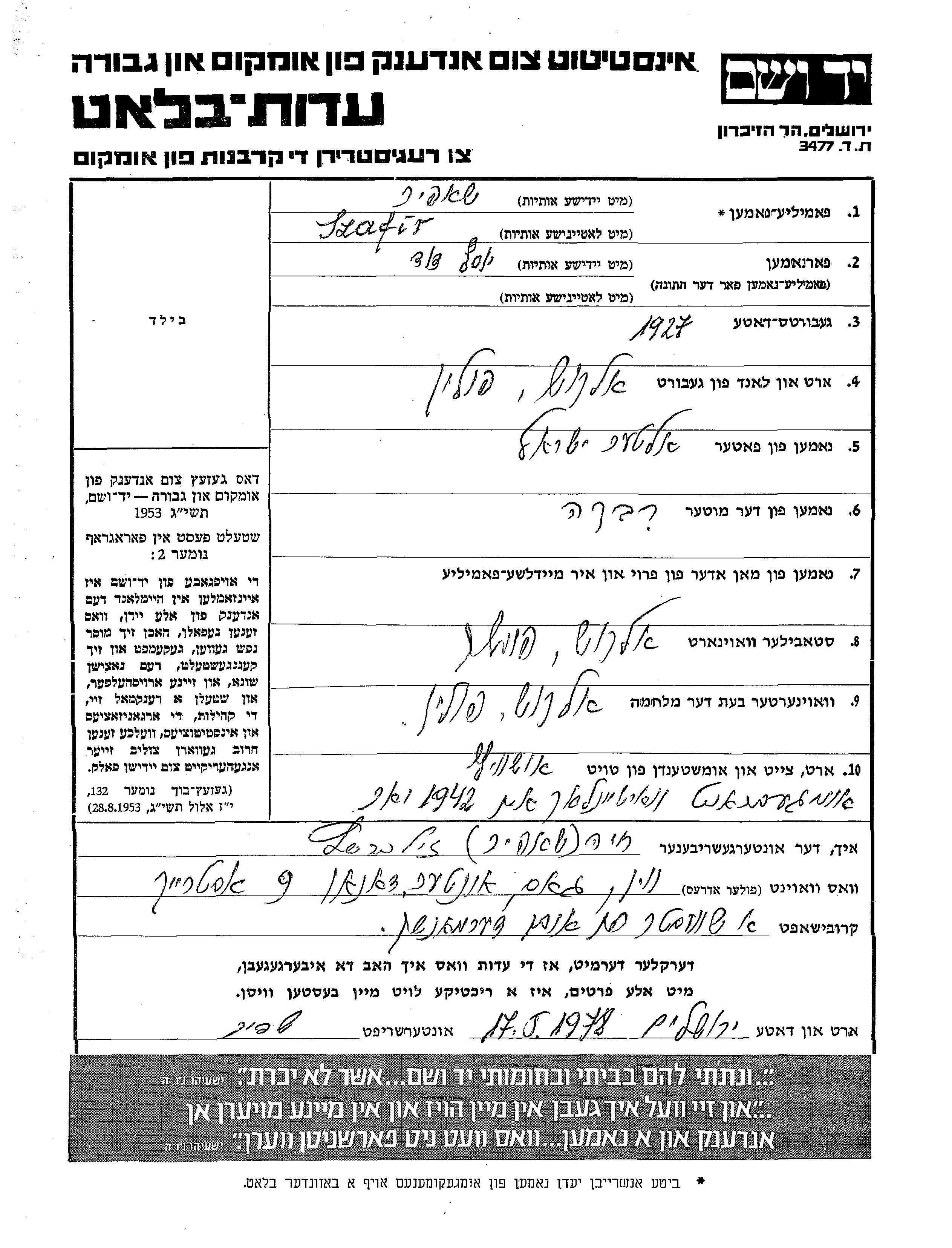 Szafir Yosef David 1927 Olkusz, Pologne Feuille de témoignage