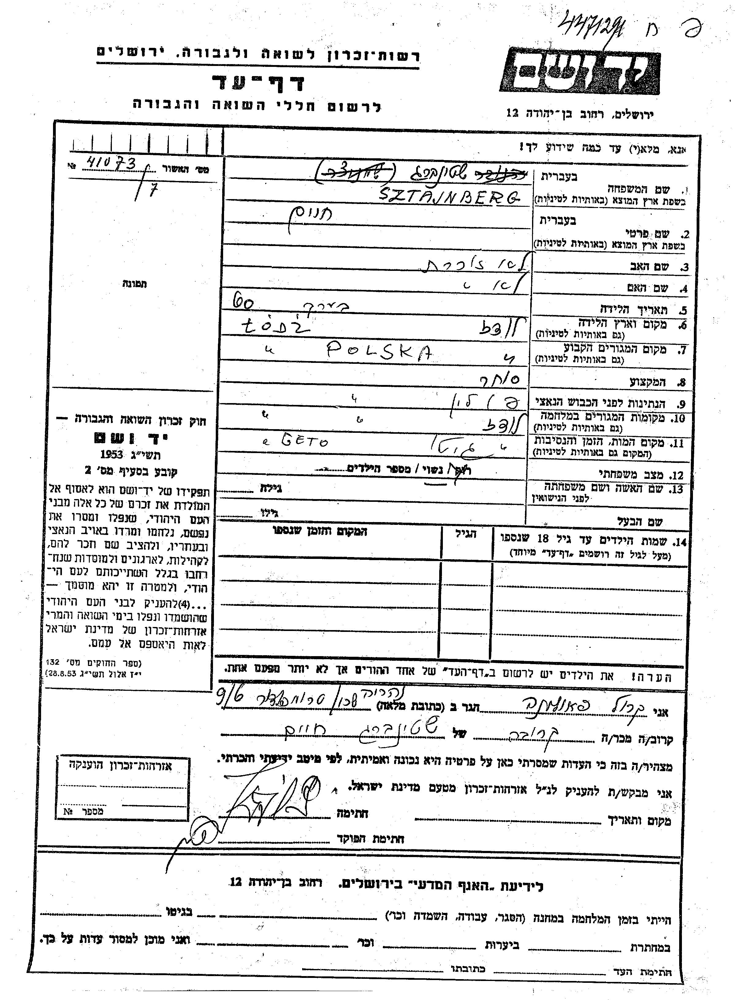 Sztajnberg Khaim Lodz, Pologne Feuille de témoignage