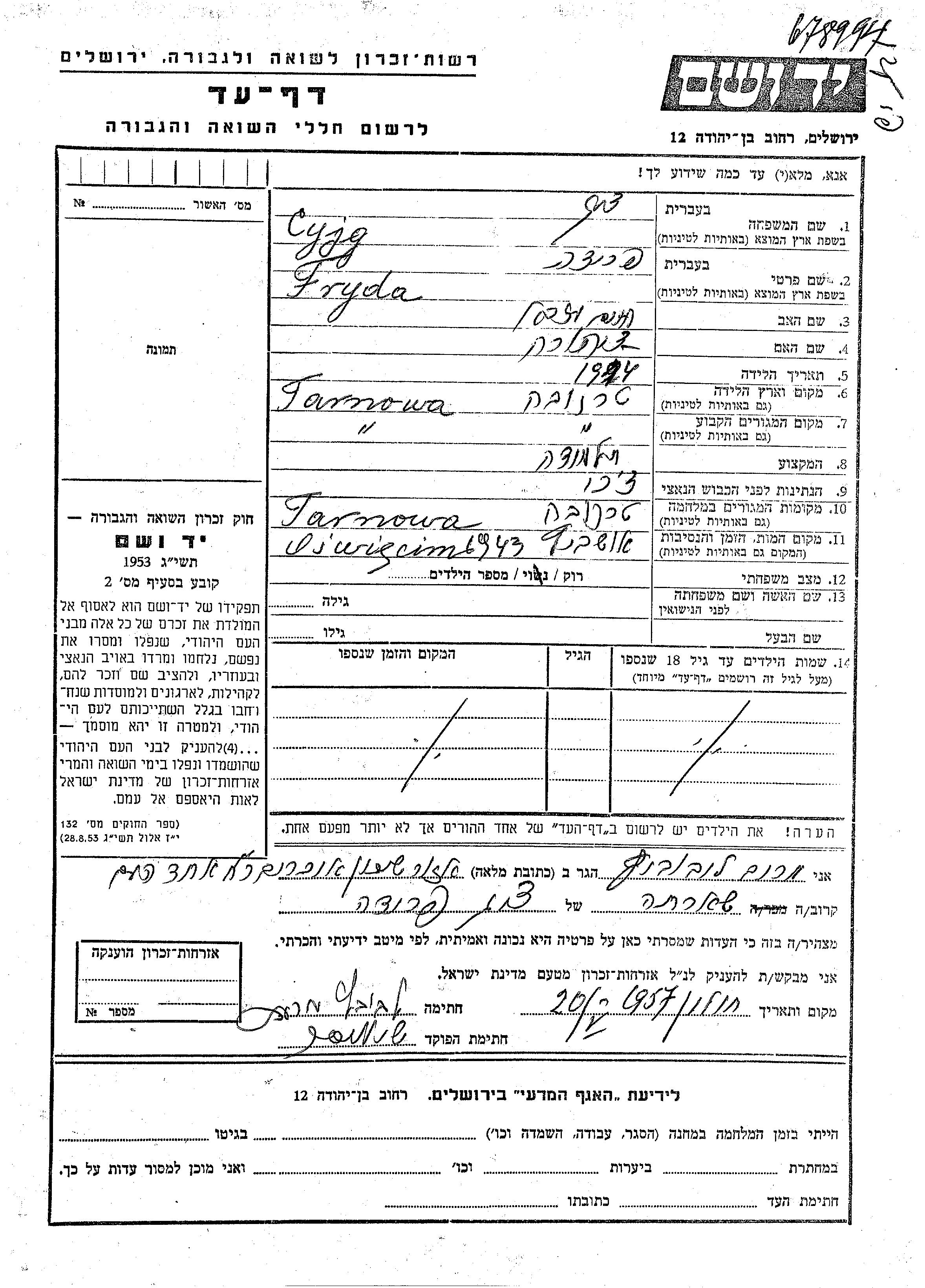 Cyjg Fryda 1914 Tarnowa, Pologne Feuille de témoignage