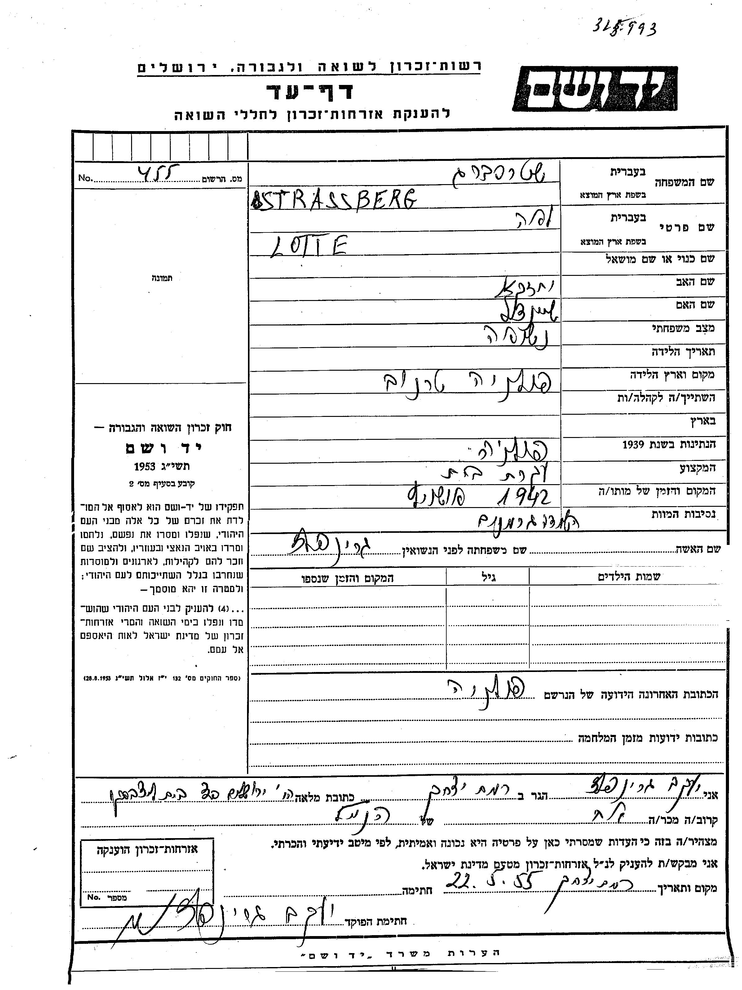 Strassberg Lotte Lea Pologne Feuille de témoignage