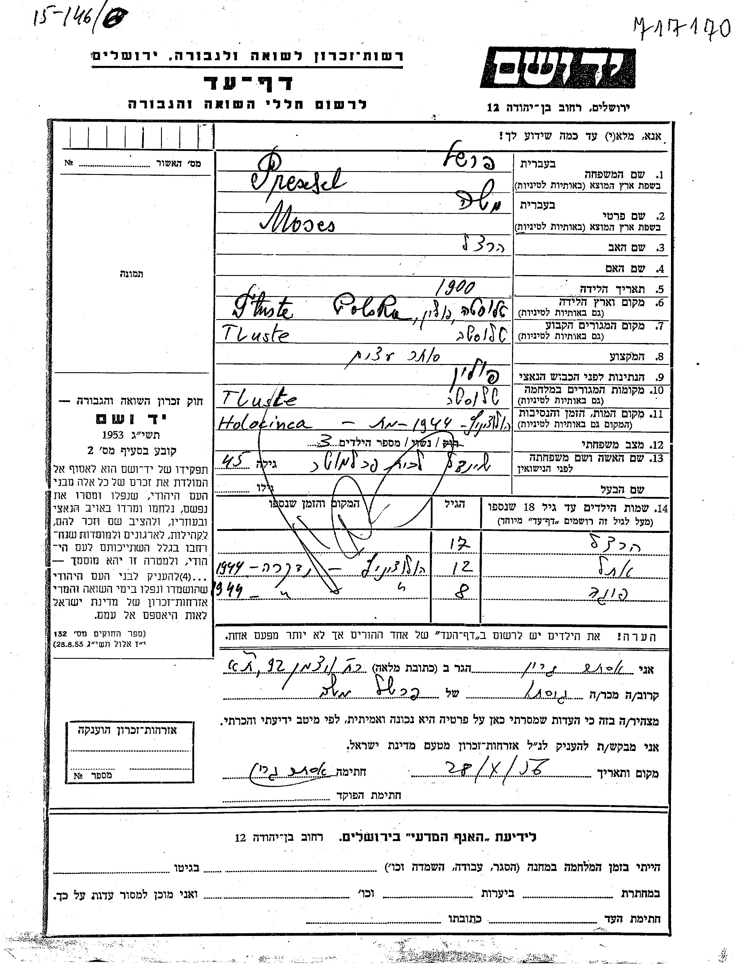 Moshe a été assassiné pendant la Shoah. Lieu de la mort: Tluste, Pologne.