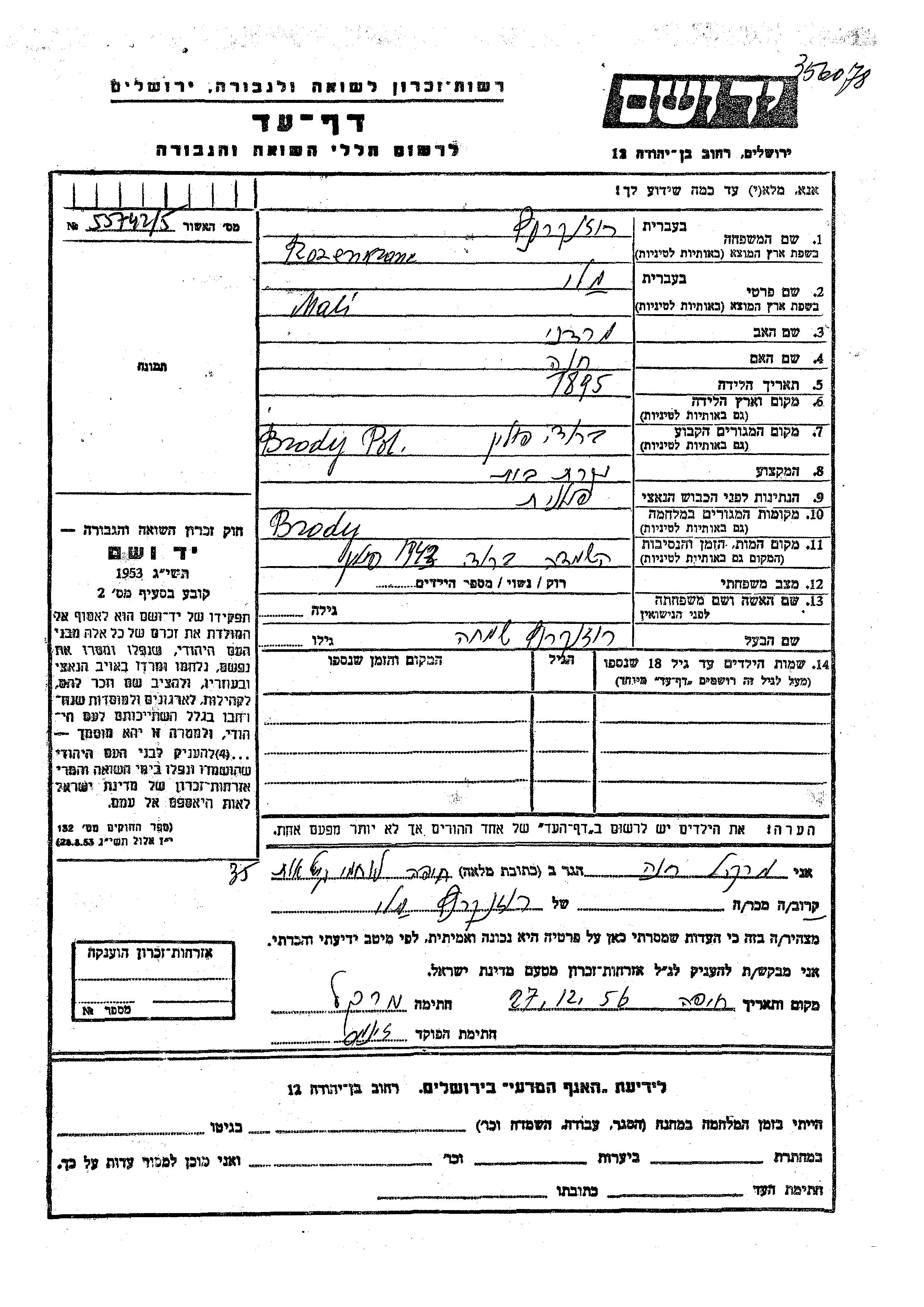 Mali Rozenkranc est née en 1895, fille de Mordekhai et de Khana. Elle était Femme au foyer et Mariée à Simkha. Avant la seconde guerre mondiale elle vivait à Brody, Pologne. Pendant la guerre, elle était à Brody, Pologne.