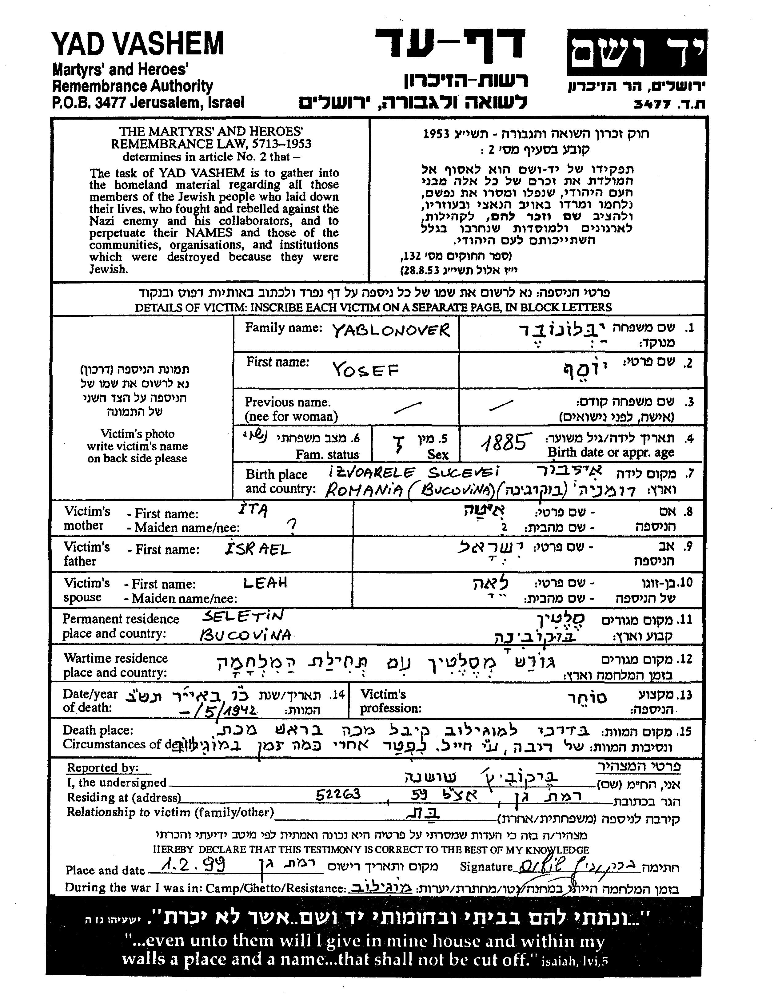 Yosef Yablonover est né à Izvoru Suceavei, Roumanie en 1885, fils de Israel et de Ita. Il était Commerçant/e et Mariée à Leah. Avant la seconde guerre mondiale il vivait à Seletin, Roumanie.