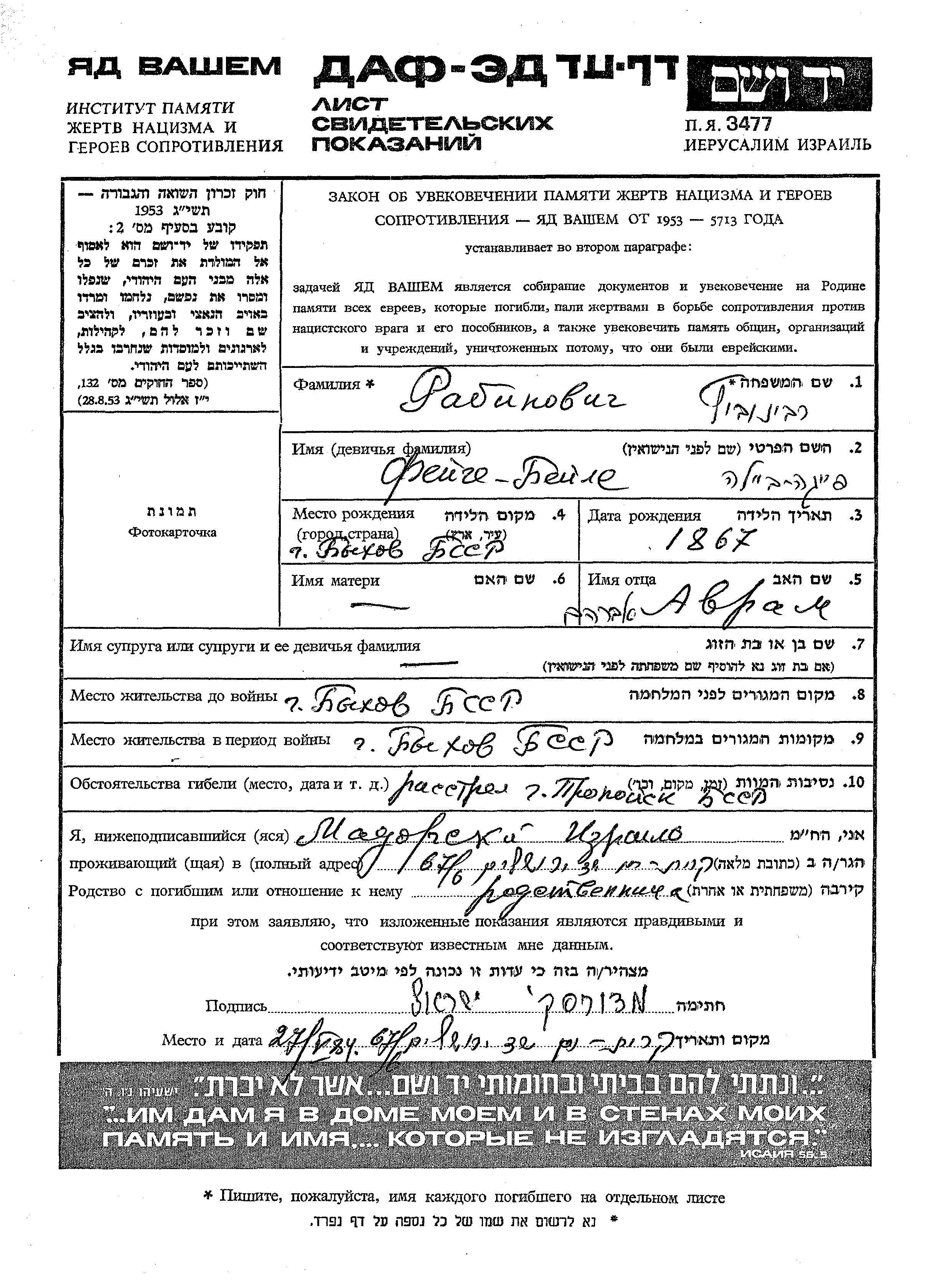 Rabinovich Beile Feiga 1867 Bichov, Bélorussie (URSS) Feuille de témoignage