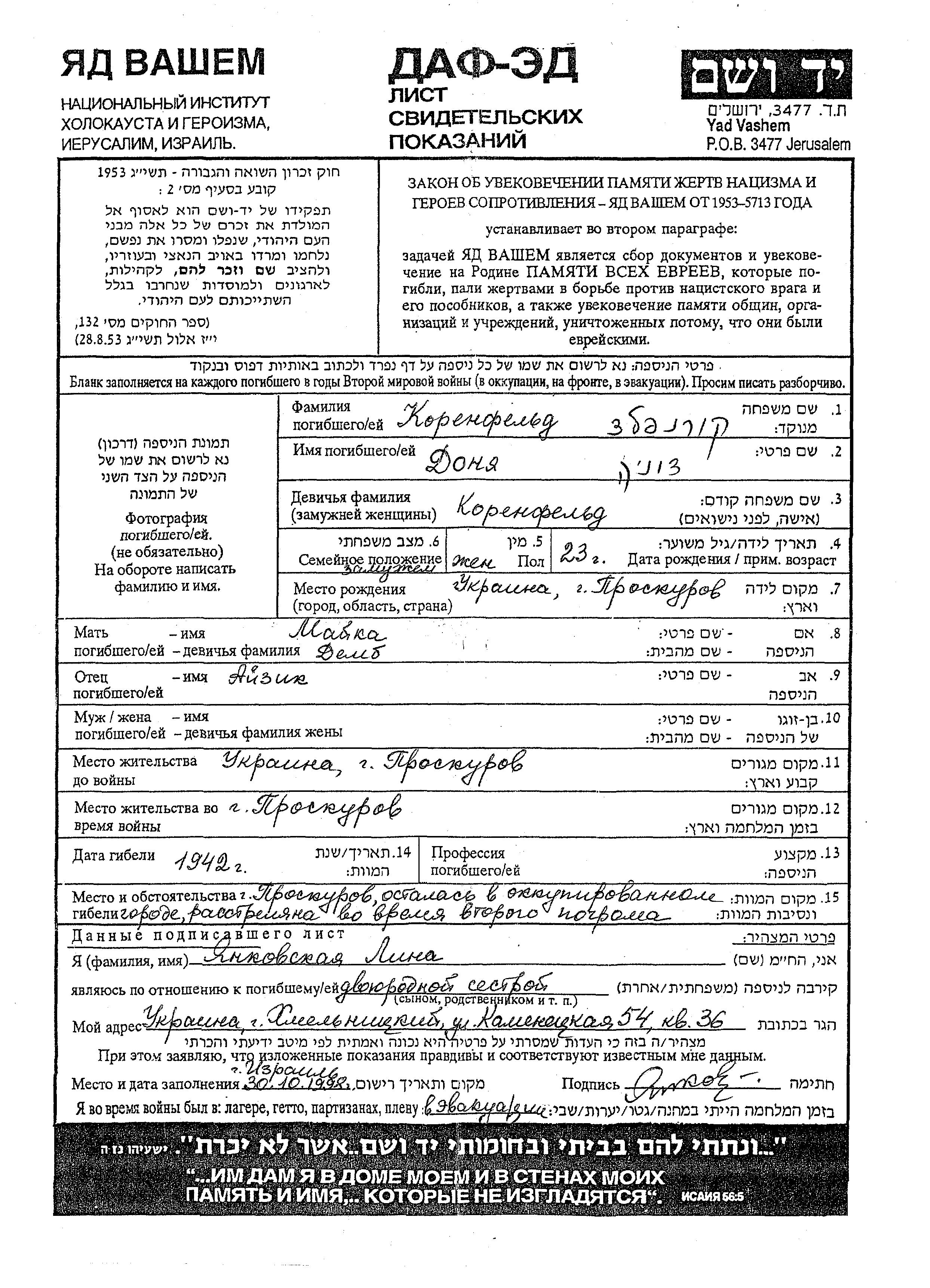Donja Korenfeld née Korenfeld est née à Proskurow, Ukraine (URSS), fille de Aizik et de Maika. Elle était Mariée. Avant la seconde guerre mondiale elle vivait à Proskurow, Ukraine (URSS). Pendant la guerre, elle était à Proskurow, Ukraine (URSS).