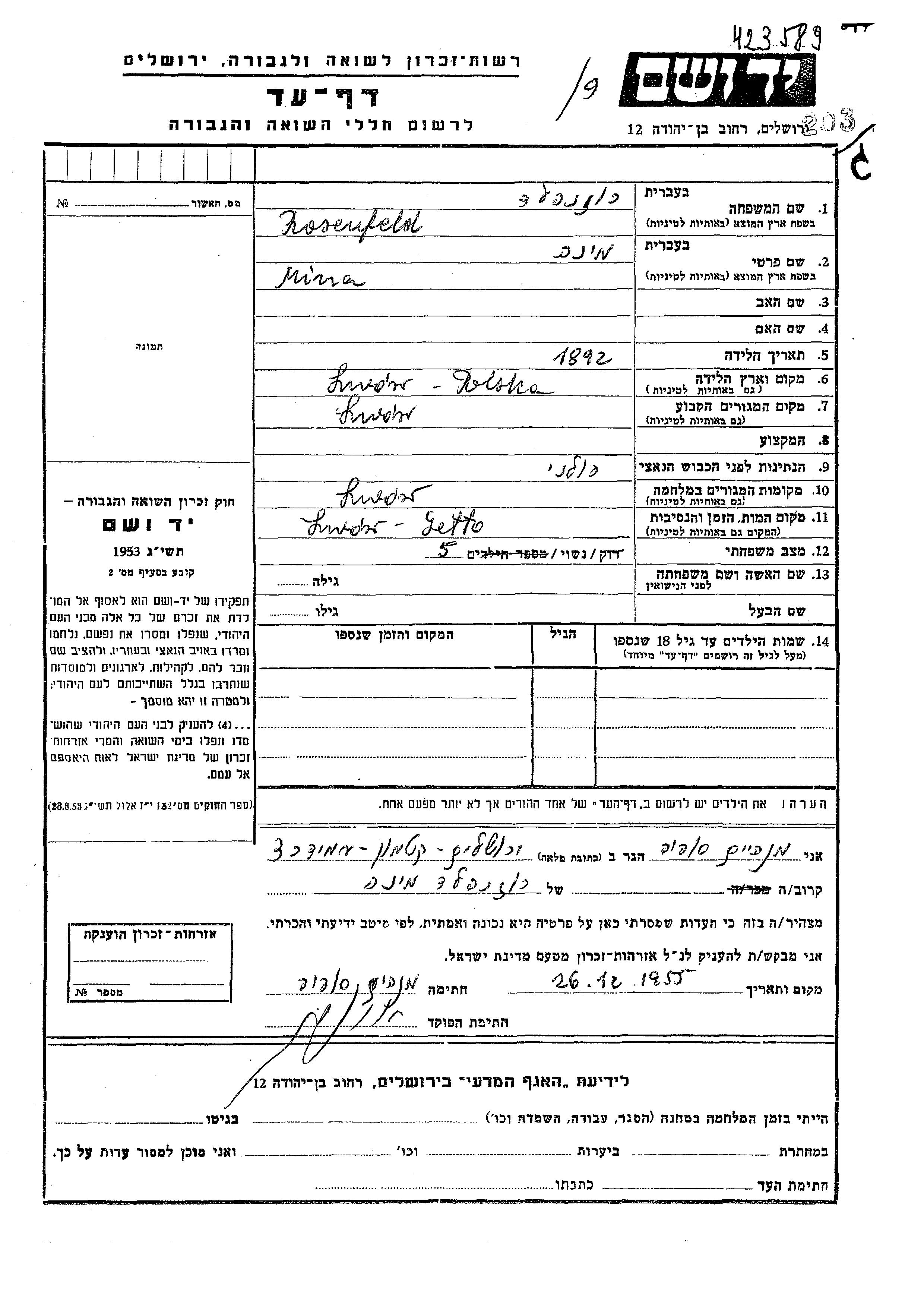 Rosenfeld Mina 1892 Lwow, Pologne Feuille de témoignage