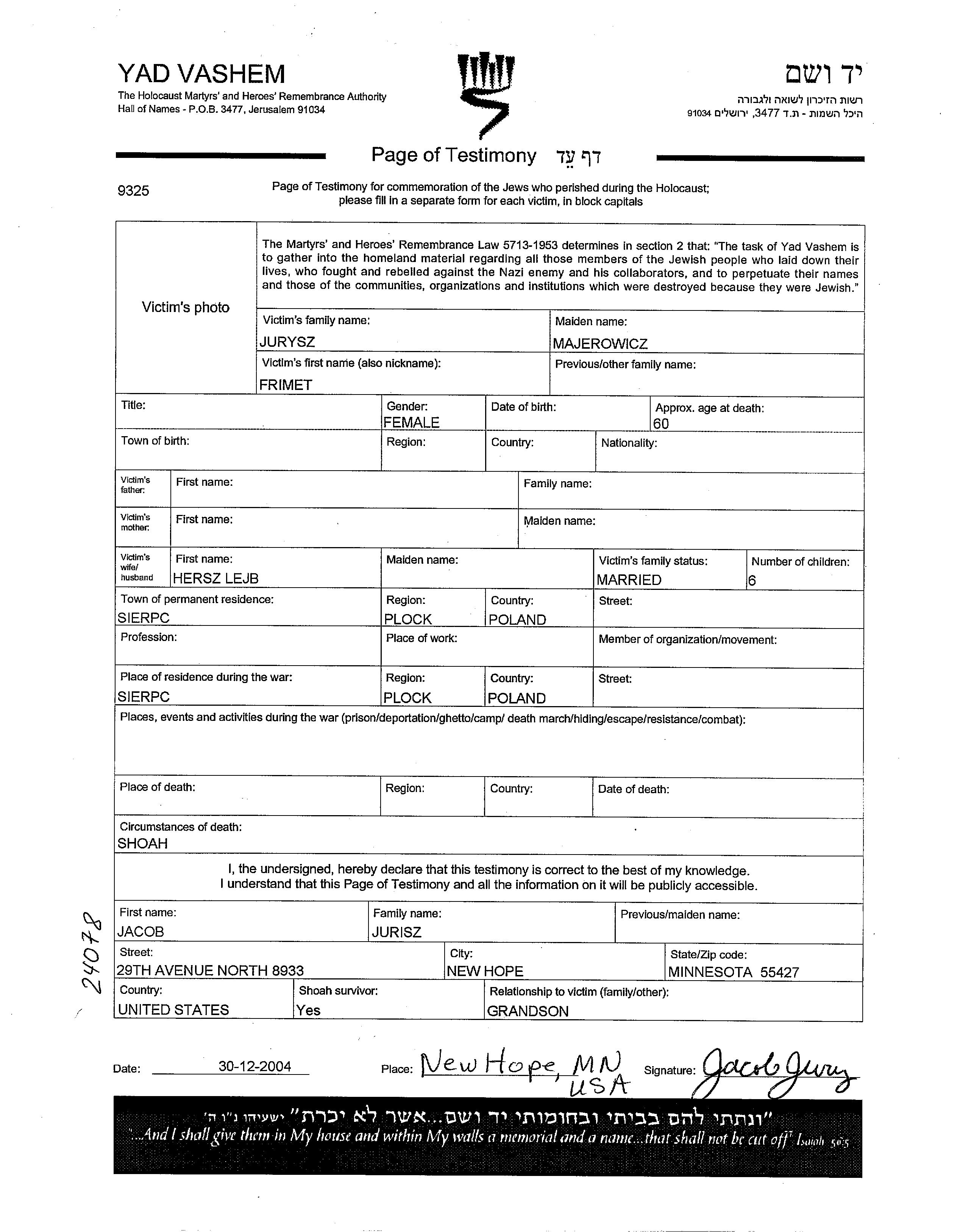 Jurysz Frimet Sierpc, Pologne Feuille de témoignage (digitale-signée)