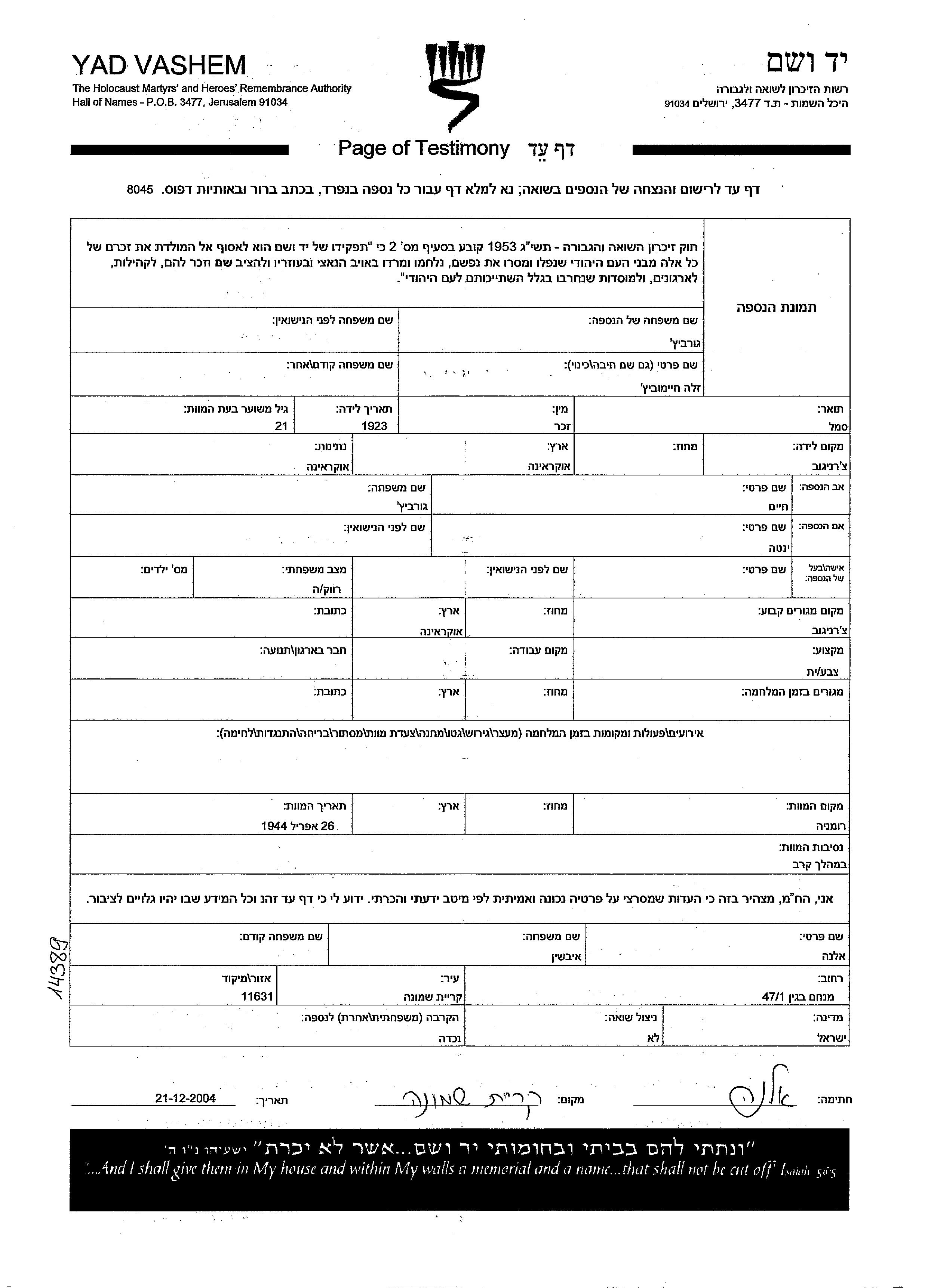 Gurevitz Zala 1923 Chernichov, Ukraine (URSS) Feuille de témoignage (digitale-signée)