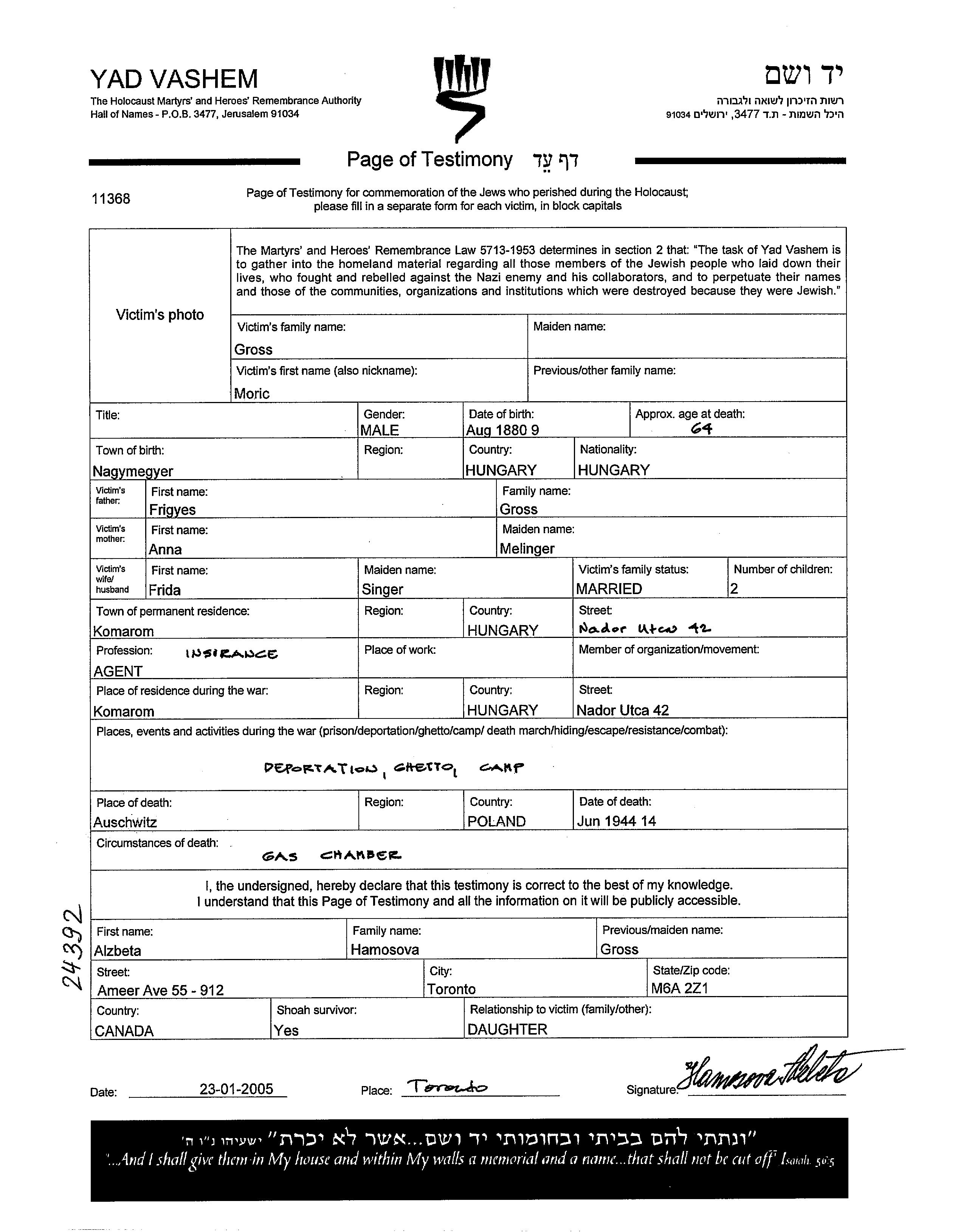 Moric Gross est né à Nagymegyer, Hongrie en 1880, fils de Frigyes et de Anna née Melinger. Il était Mariée à Frida née Singer. Avant la seconde guerre mondiale il vivait à Komarom, Hongrie. Au cours de la guerre, il était à Komarom, Hongrie.