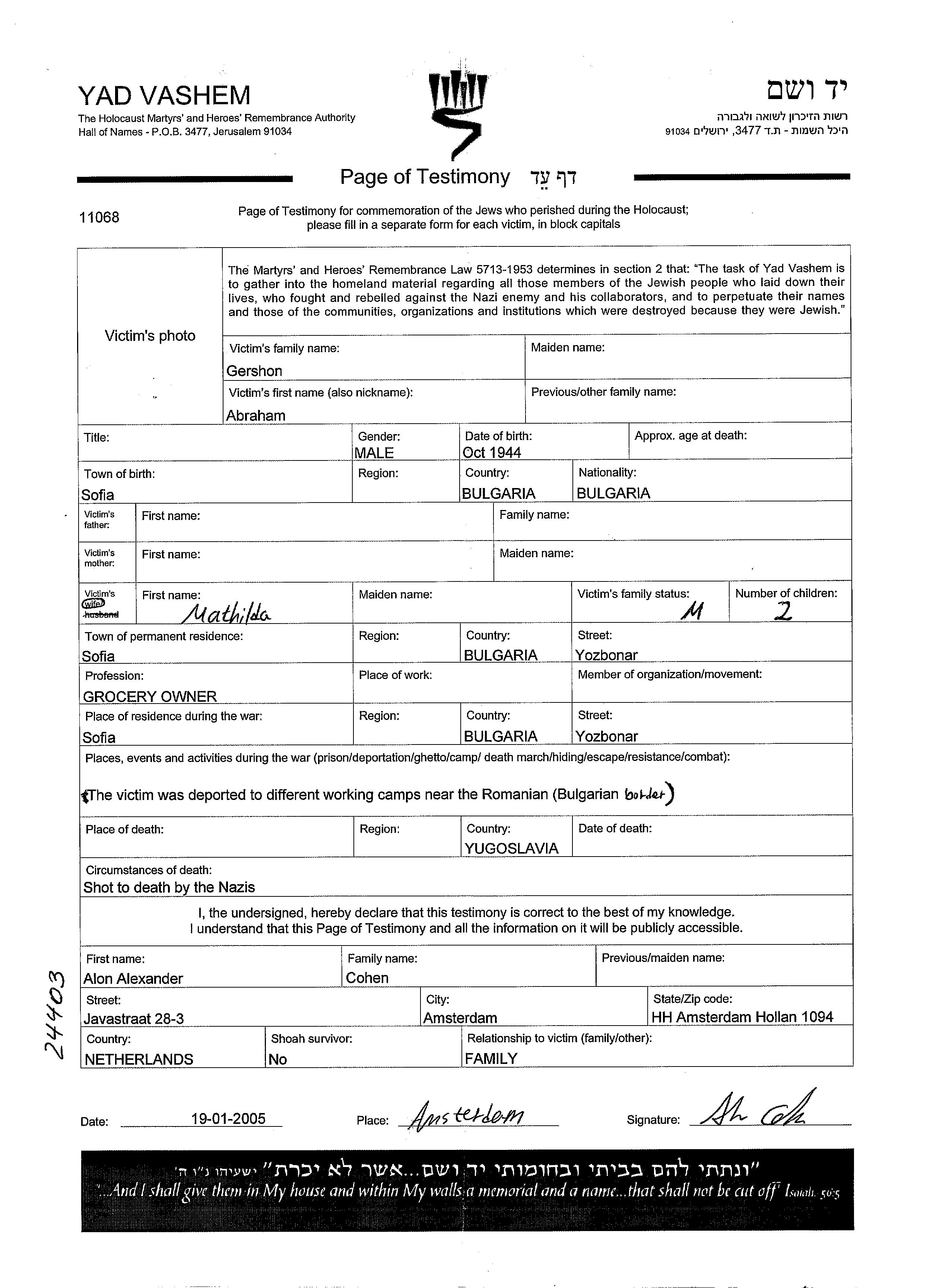 Abraham Gershon est né à Sofia, Roumanie. Il était Mariée à Mathilda. Avant la seconde guerre mondiale il vivait à Sofia, Roumanie. Au cours de la guerre, il était à Sofia, Roumanie.
