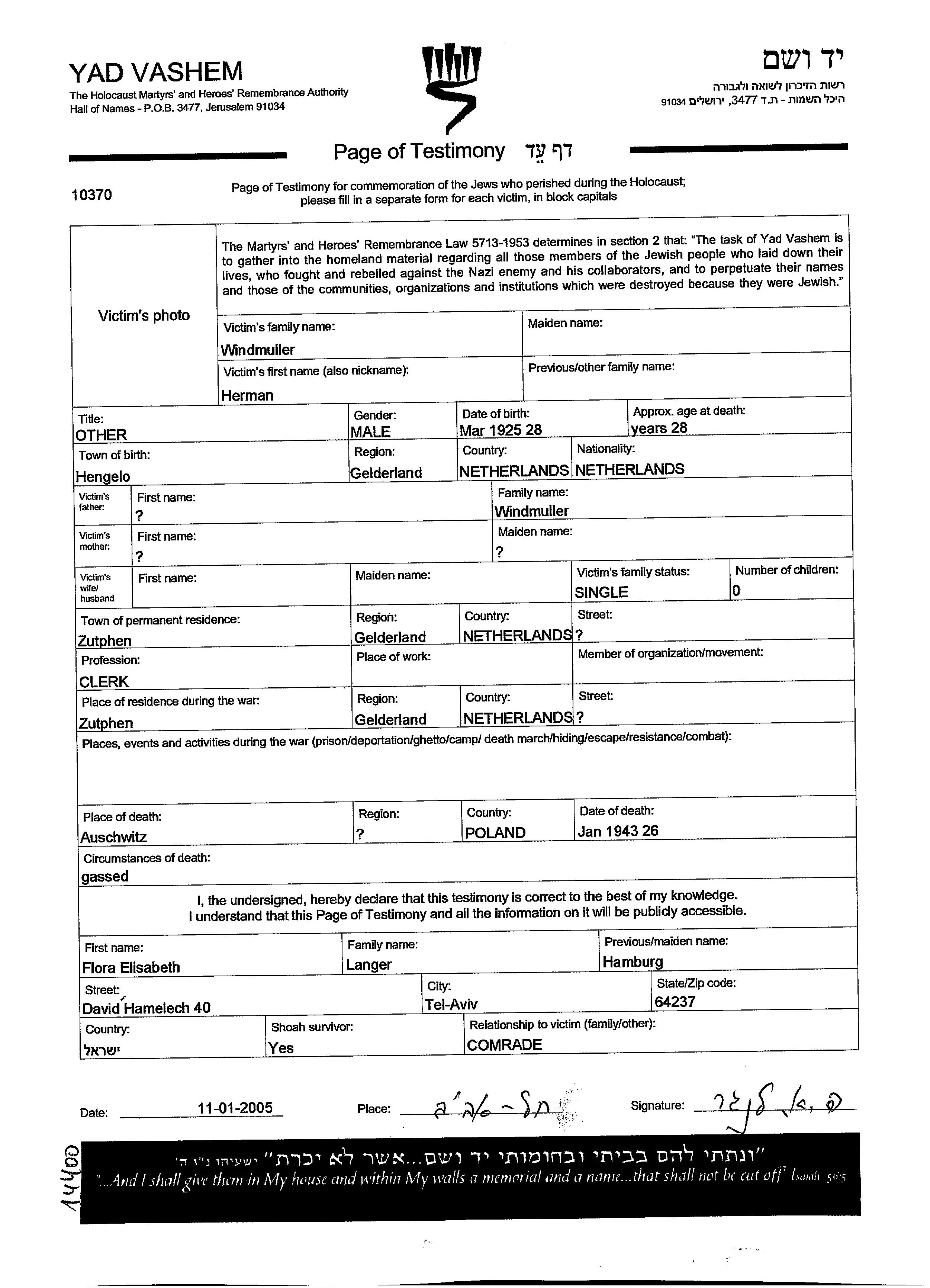 Herman Windmuller est né à Hengelo, Pays-Bas en 1925. Il était Célibataire. Avant la seconde guerre mondiale il vivait à Zutphen, Pays-Bas. Au cours de la guerre, il était à Zutphen, Pays-Bas.