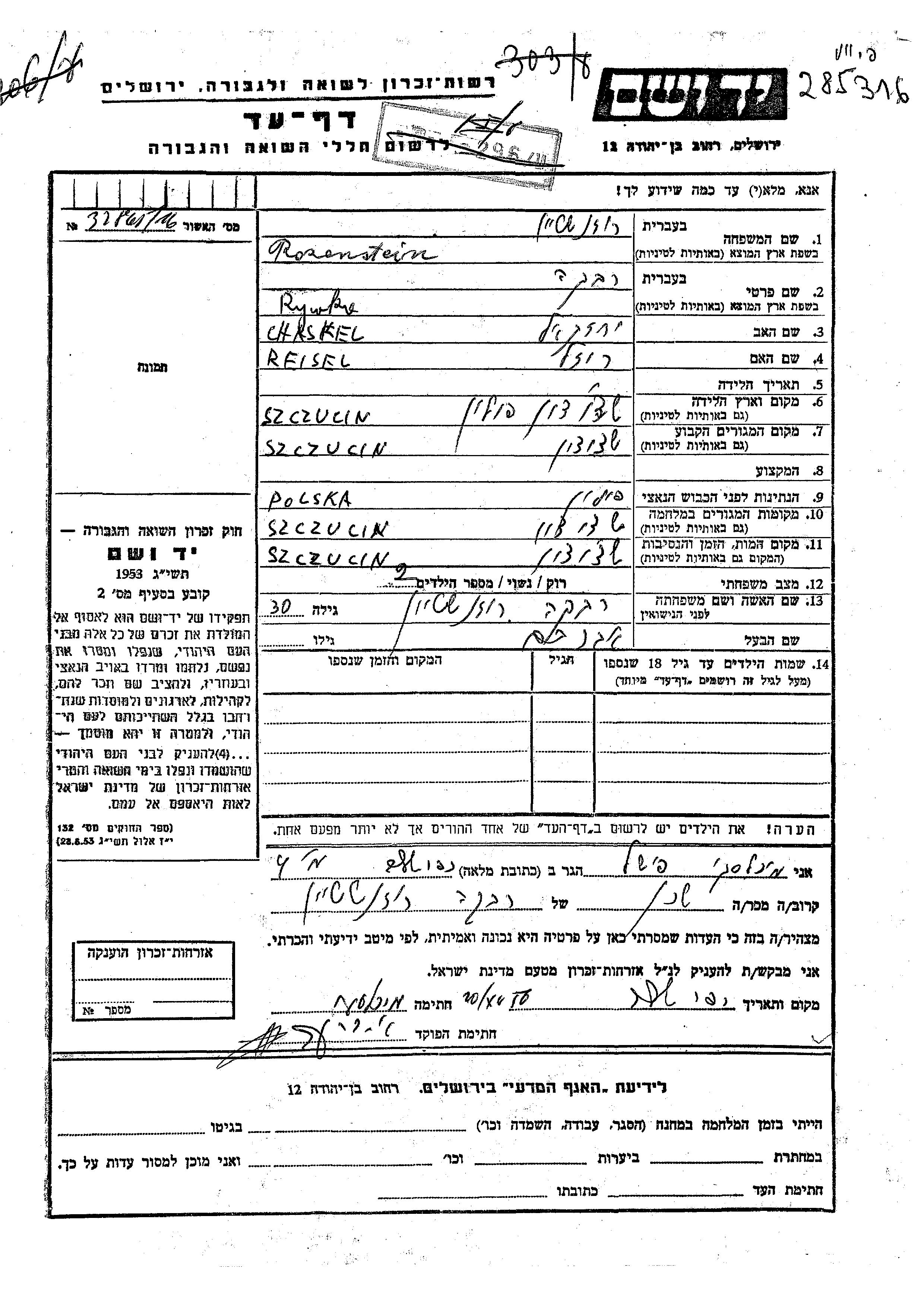 Rozenstein Rywka Szczucin, Pologne Feuille de témoignage