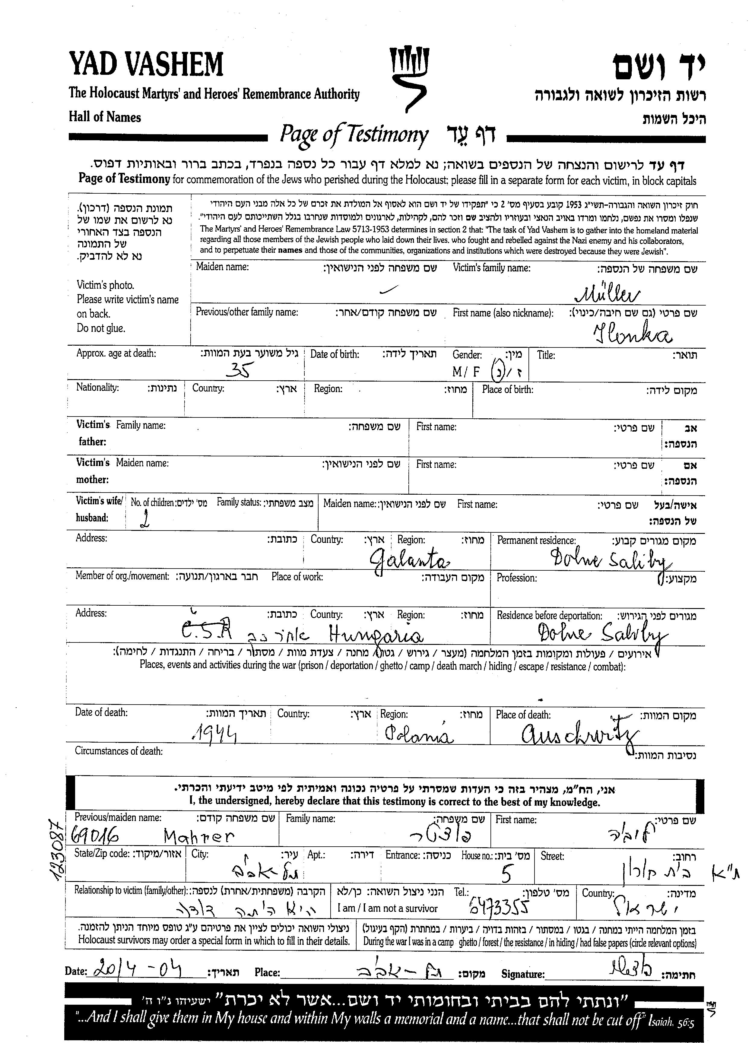 Ylonka Muller. Avant la seconde guerre mondiale elle vivait à Dolne Saliby, Tchécoslovaquie. Pendant la guerre, elle était à Dolne Saliby, Tchécoslovaquie.