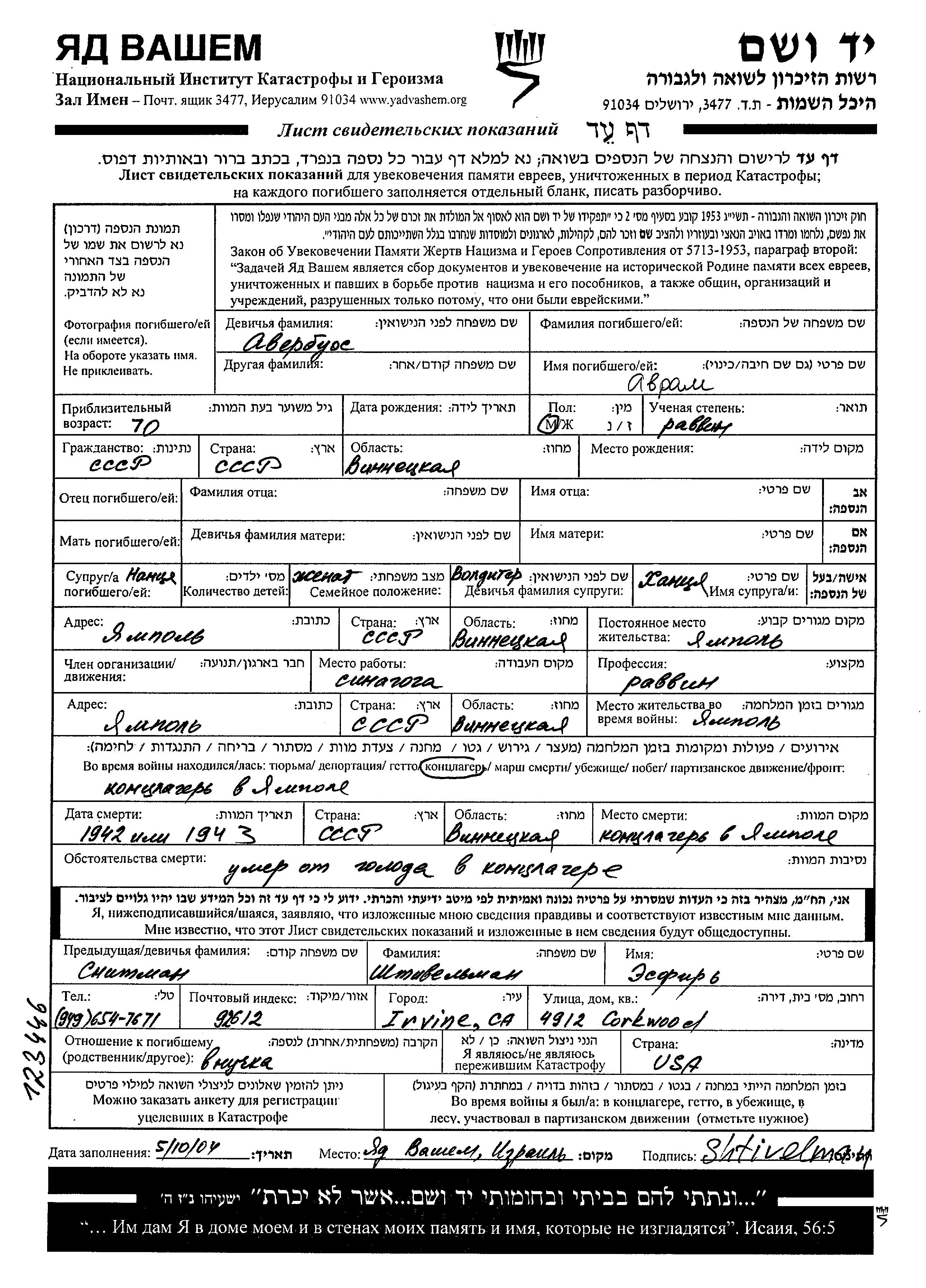 Averbukh Avram Yampol, Ukraine (URSS) Feuille de témoignage