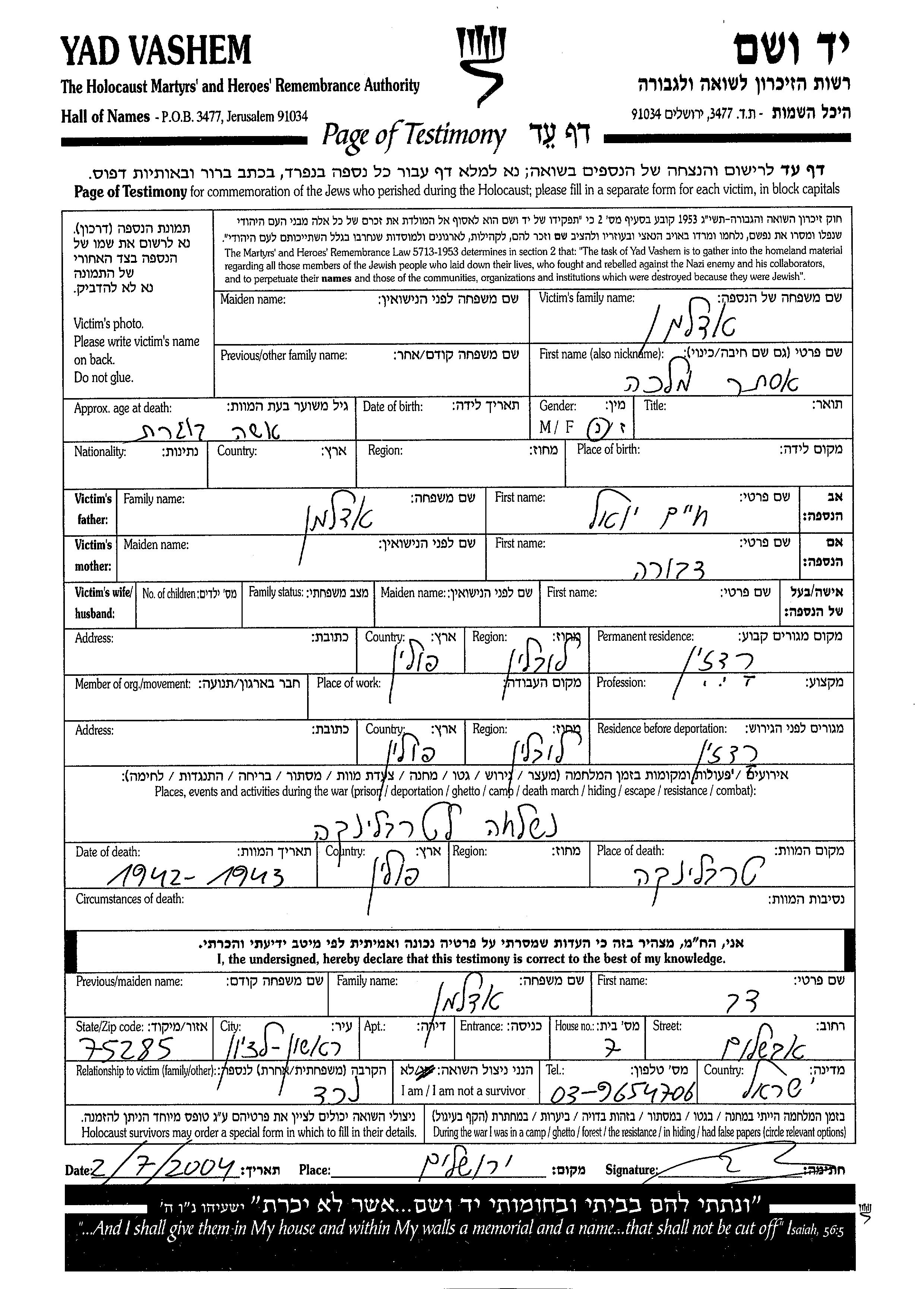 Yad Vashem - Pages of Testimony Names Memorial Collection