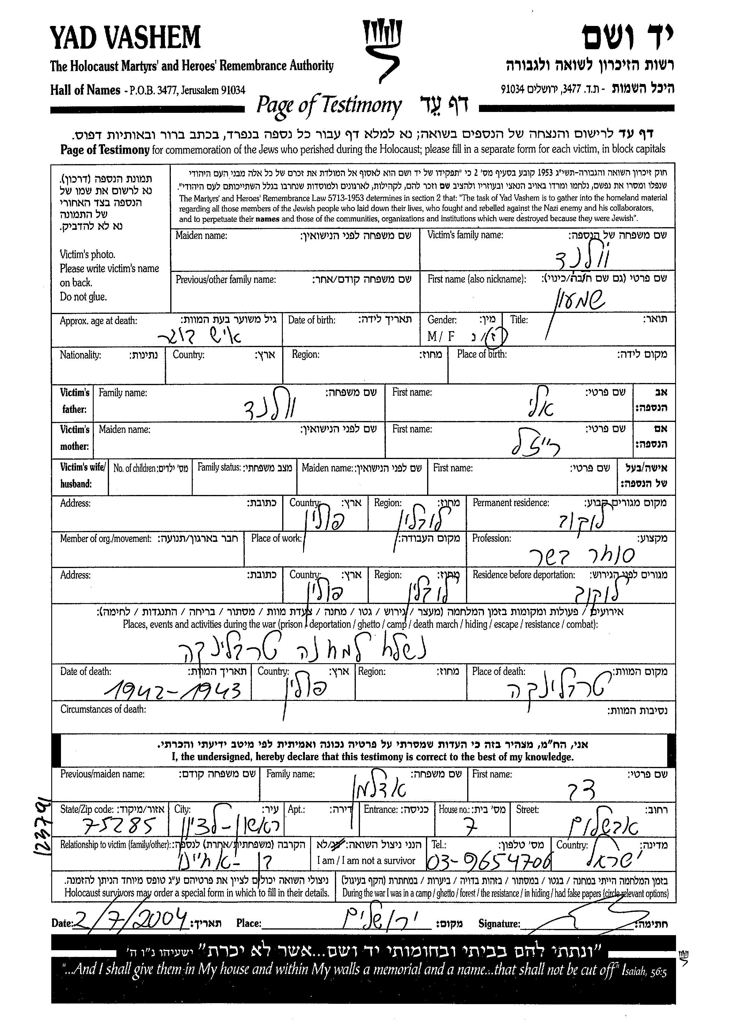 Yad Vashem - Pages of Testimony Names Memorial Collection
