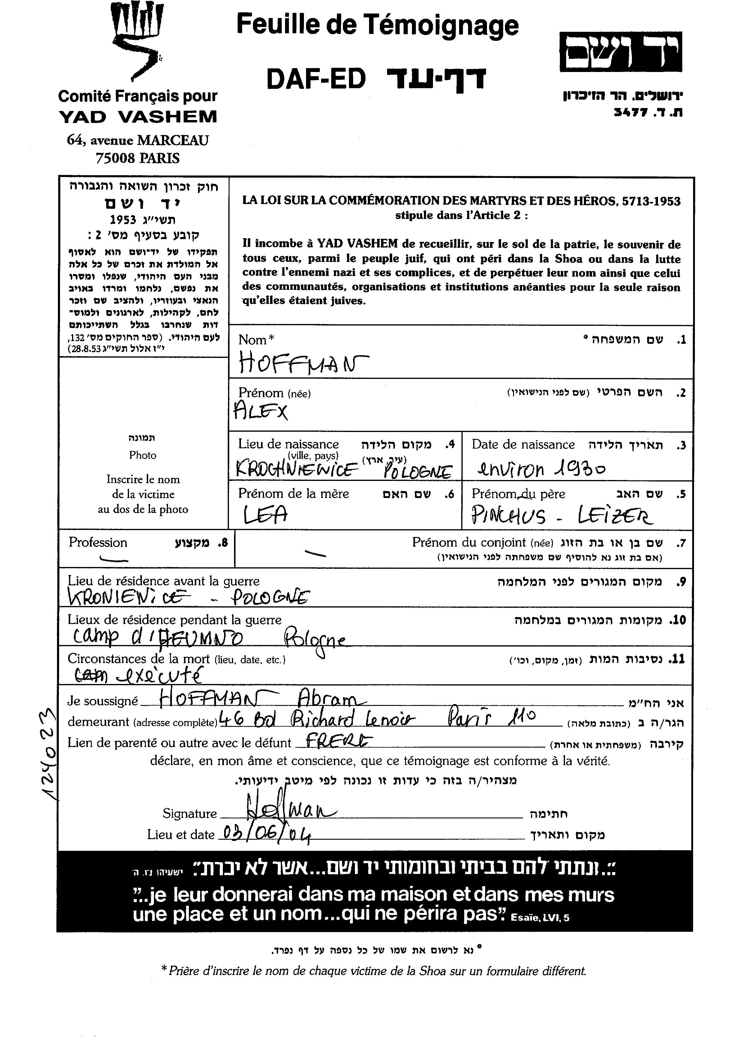 Hoffman Alex 1930 Krosniewice, Pologne Feuille de témoignage