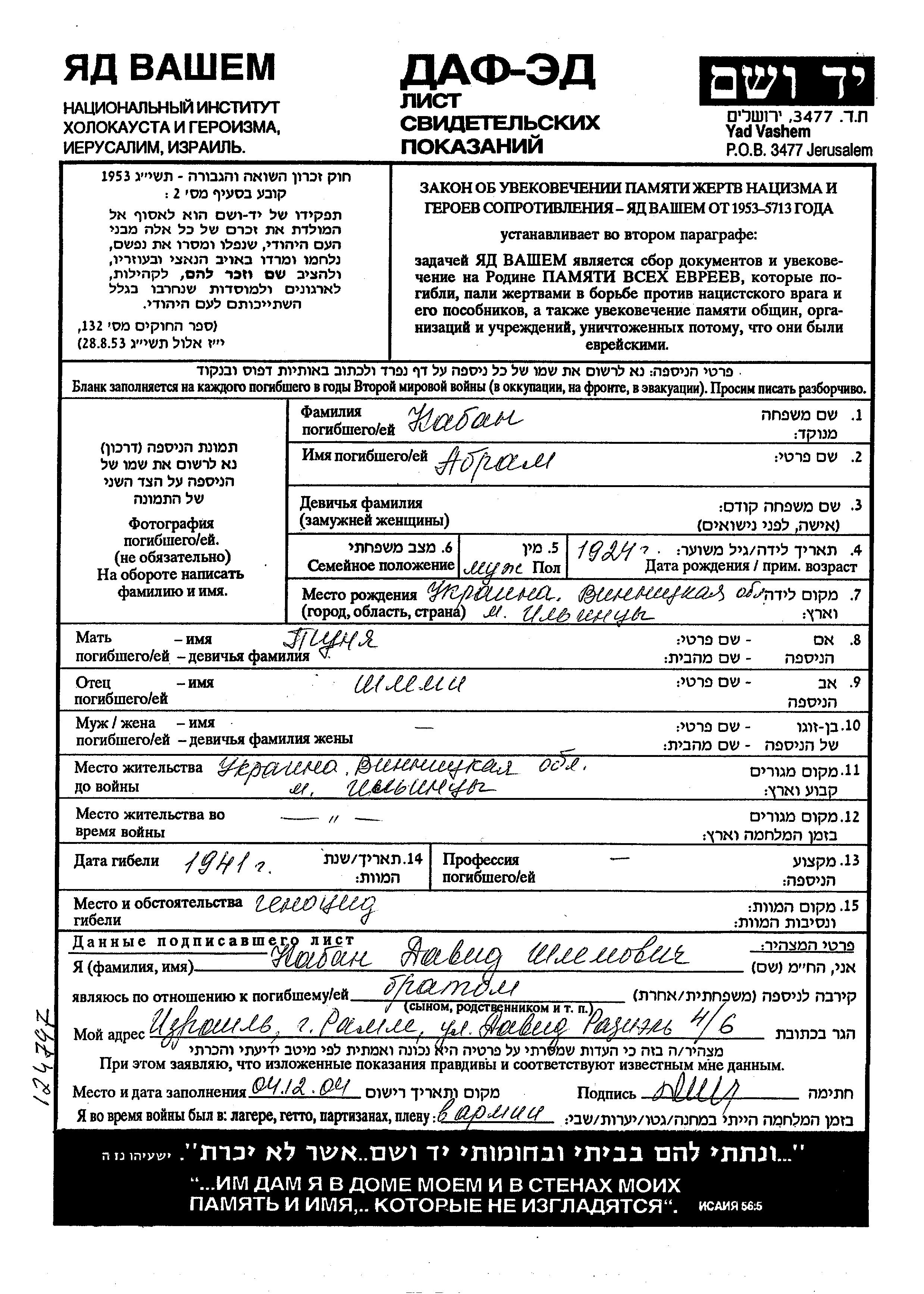Kaban Abram 1924 Ilintsy, Ukraine (URSS) Feuille de témoignage