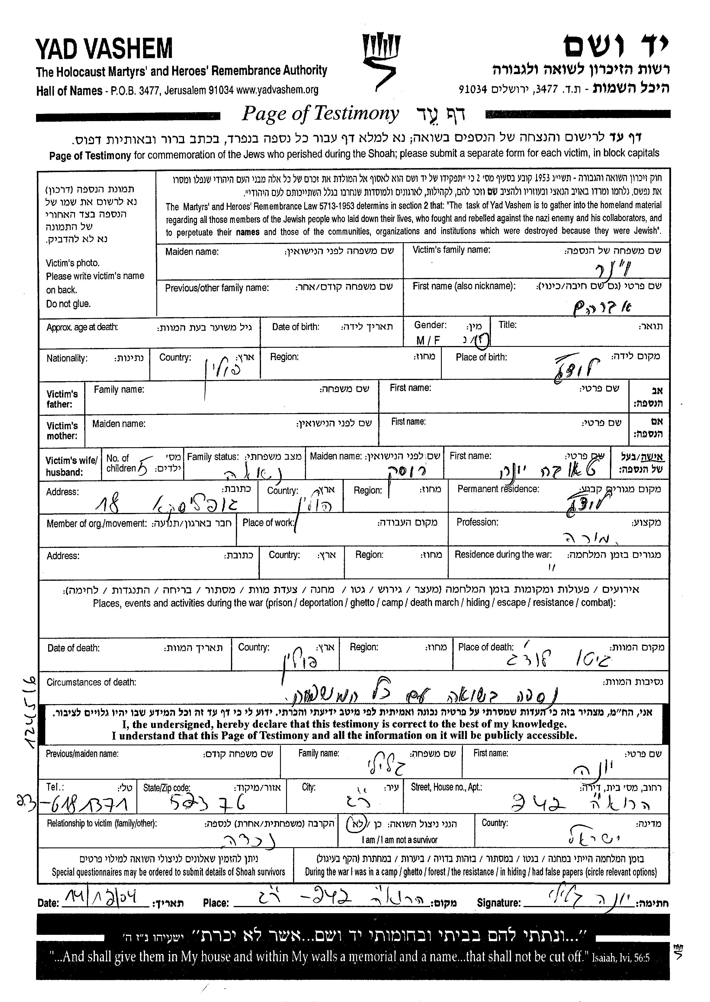 Yad Vashem - Pages of Testimony Names Memorial Collection