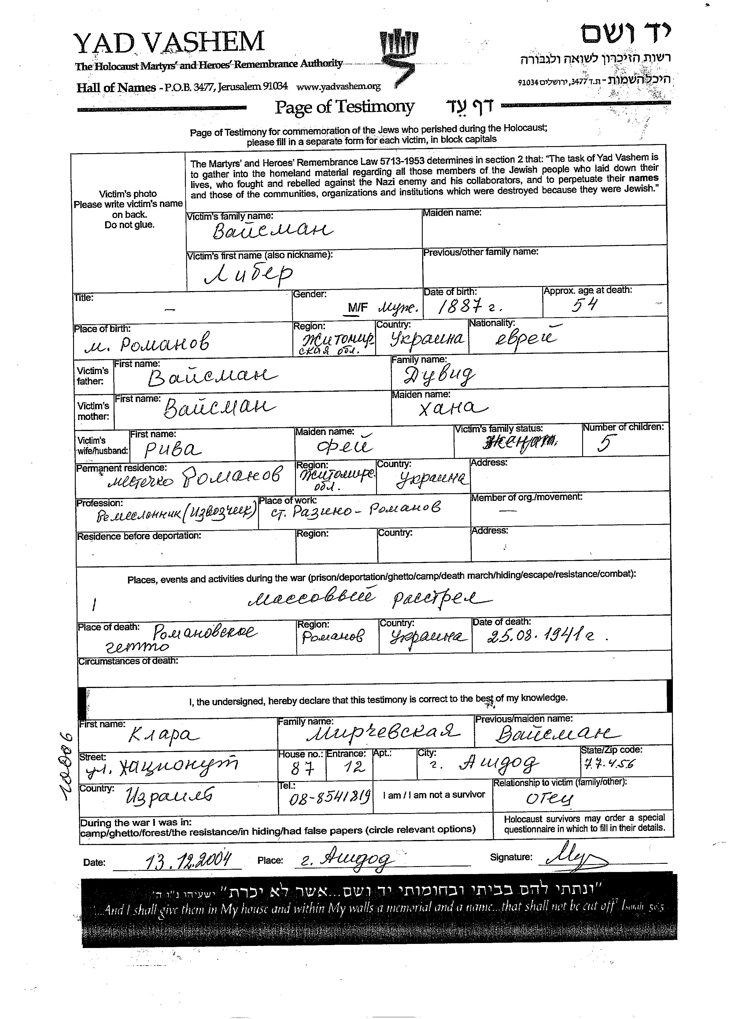 Yad Vashem - Pages of Testimony Names Memorial Collection