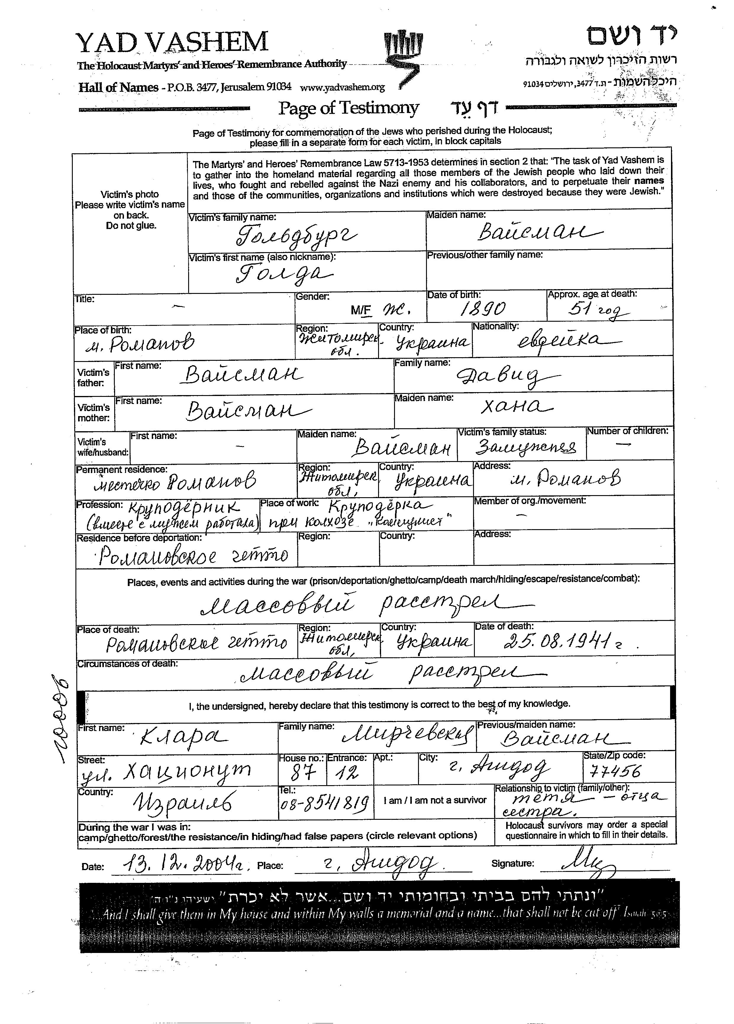 Golda Goldburg née Vaisman est née à Romanov, Ukraine (URSS) en 1890, fille de David et de Khana. Elle était Mariée. Avant la seconde guerre mondiale elle vivait à Romanov, Ukraine (URSS). Pendant la guerre, elle était à Romanov, Ukraine (URSS).