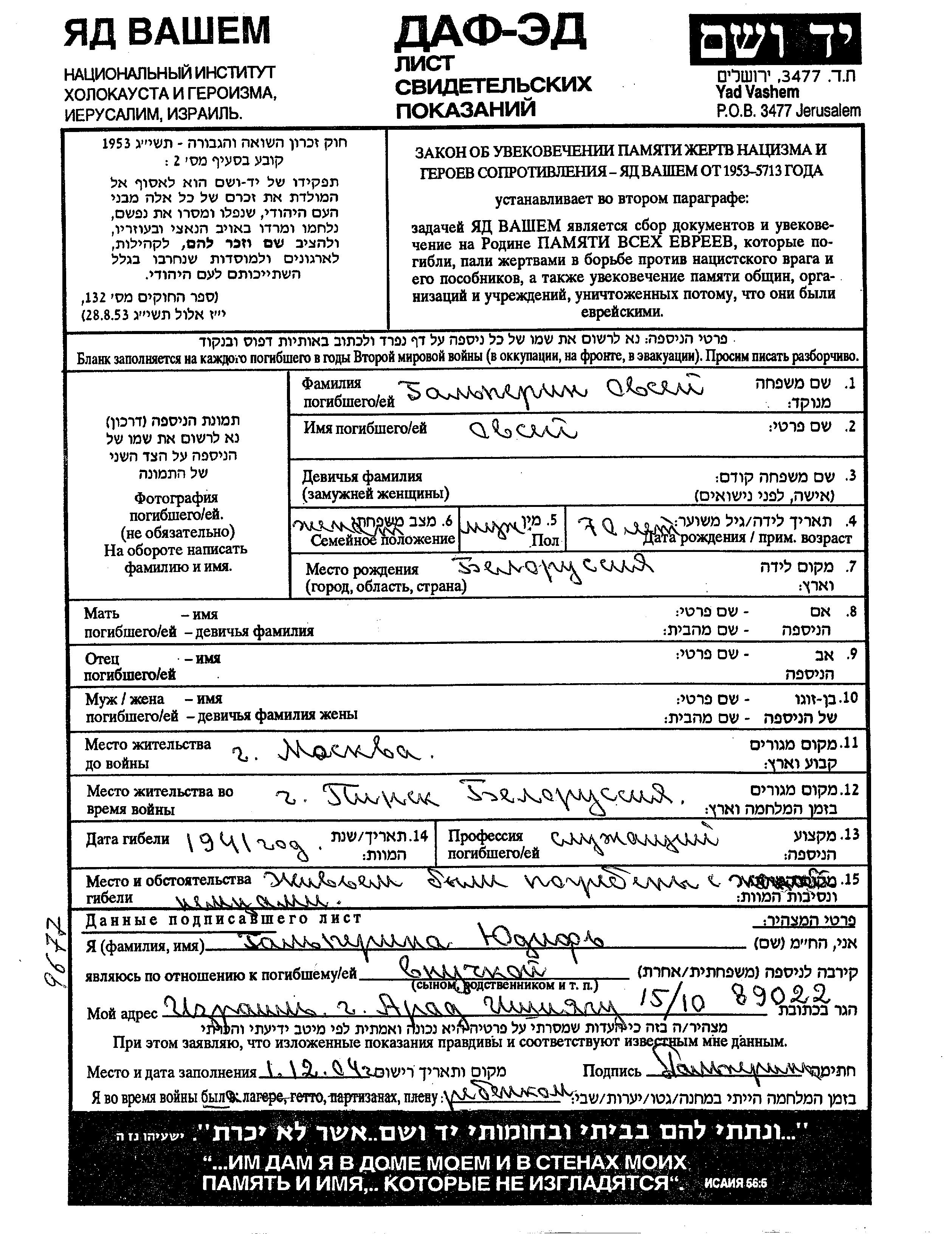 Yad Vashem - Pages of Testimony Names Memorial Collection