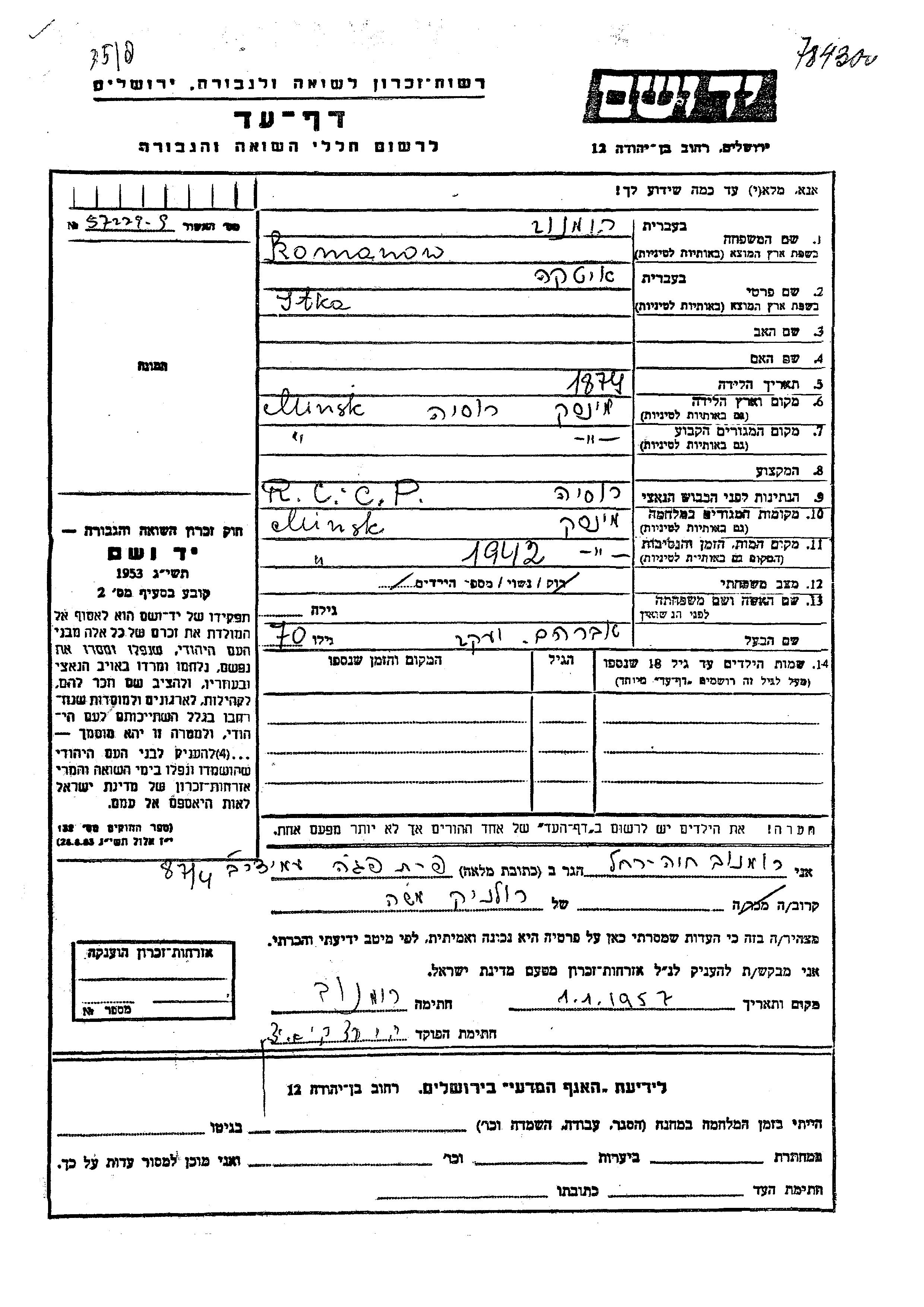 Itka Romanow est née à Minsk, Bélorussie (URSS) en 1874. Elle était Mariée à Avraham Yaakov. Avant la seconde guerre mondiale elle vivait à Minsk, Bélorussie (URSS). Pendant la guerre, elle était à Minsk, Bélorussie (URSS).