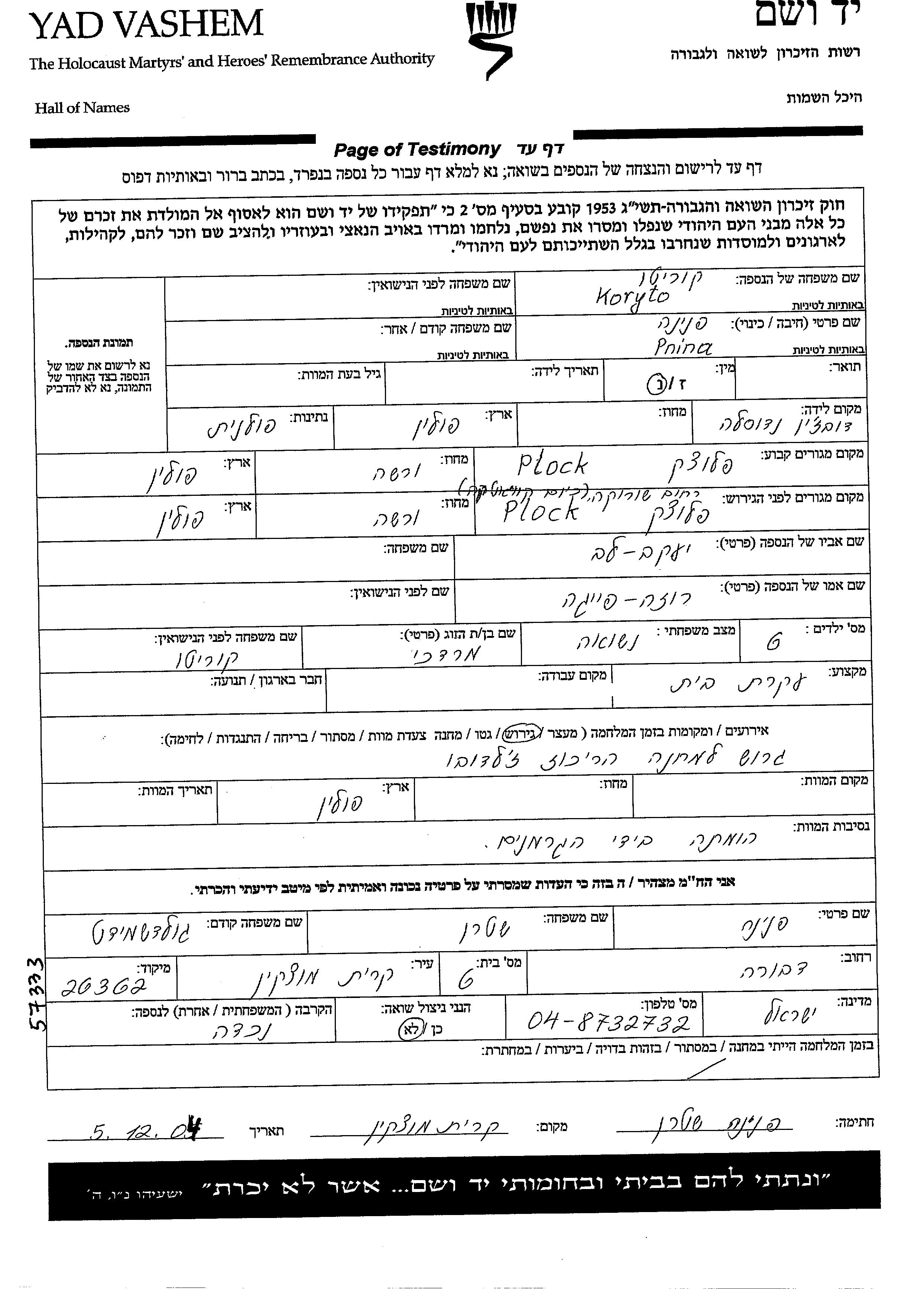 Pnina Koryto est née à Dobzhin nad Drvents, Pologne, fille de Lev Yaakov et de Roza Feiga. Elle était Mariée à Mordekhai. Avant la seconde guerre mondiale elle vivait à Plock, Pologne. Pendant la guerre, elle était à Plock, Pologne.