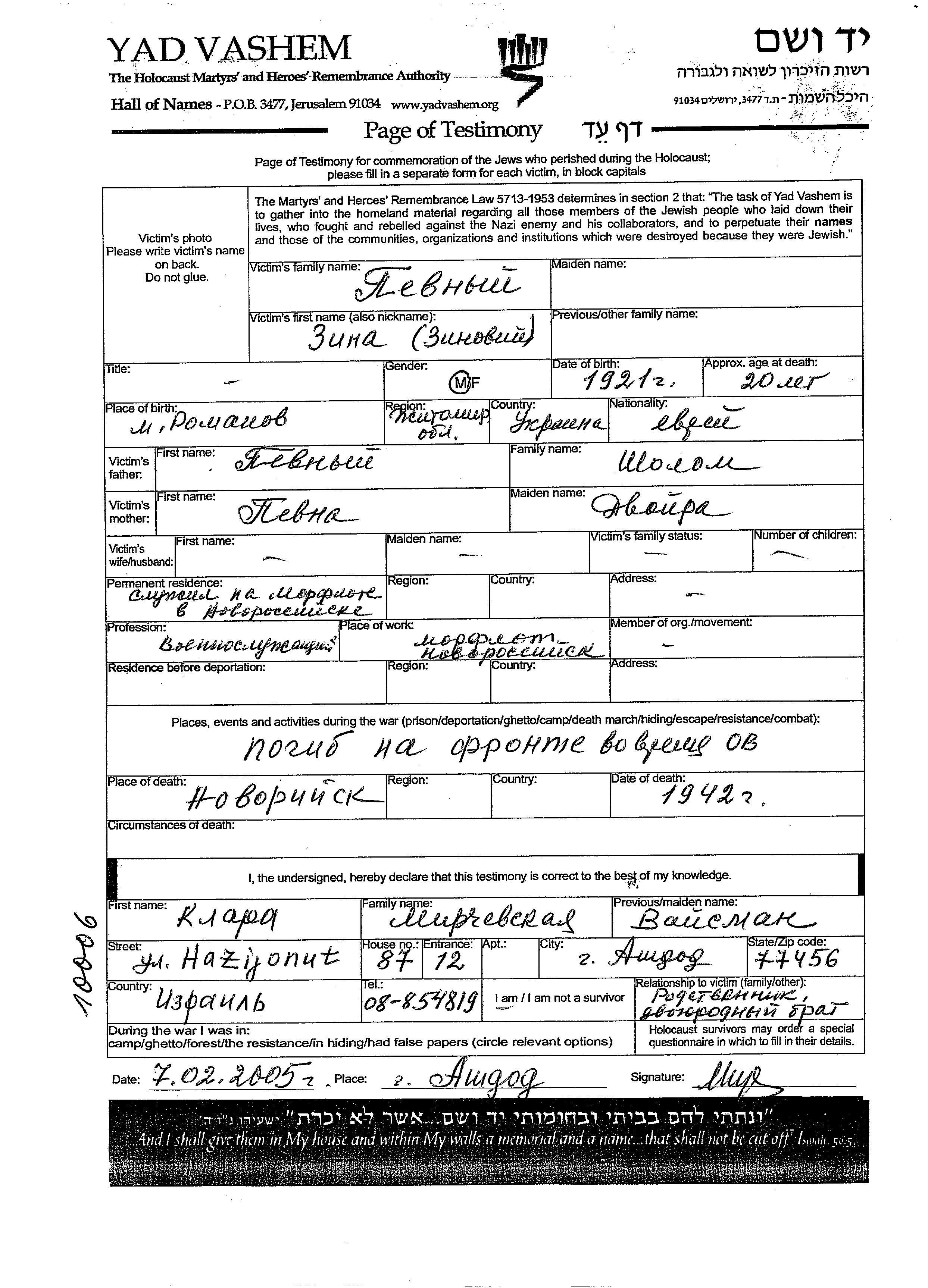 Yad Vashem - Pages of Testimony Names Memorial Collection