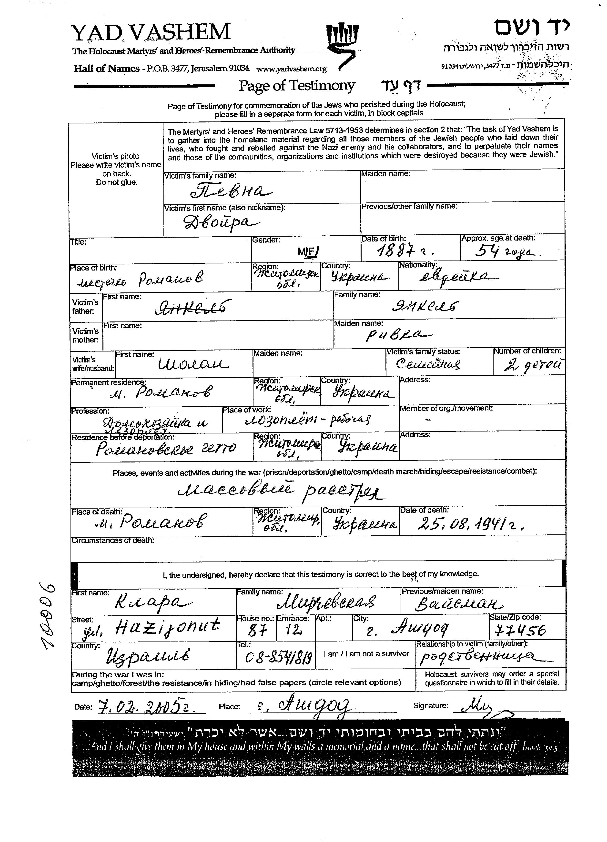 Yad Vashem - Pages of Testimony Names Memorial Collection