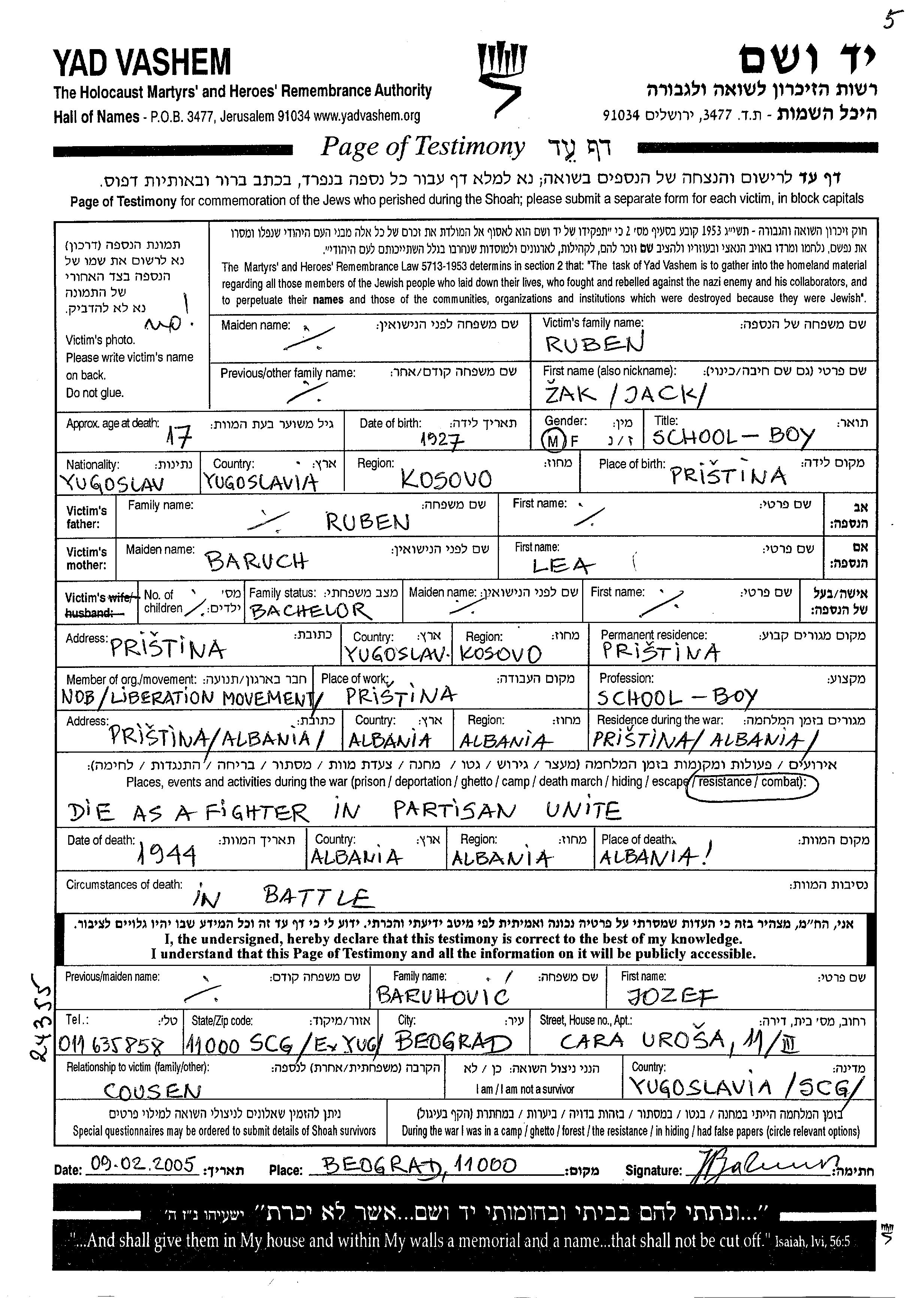 Ruben Jacky 1927 Pristina, Yugoslavie Feuille de témoignage