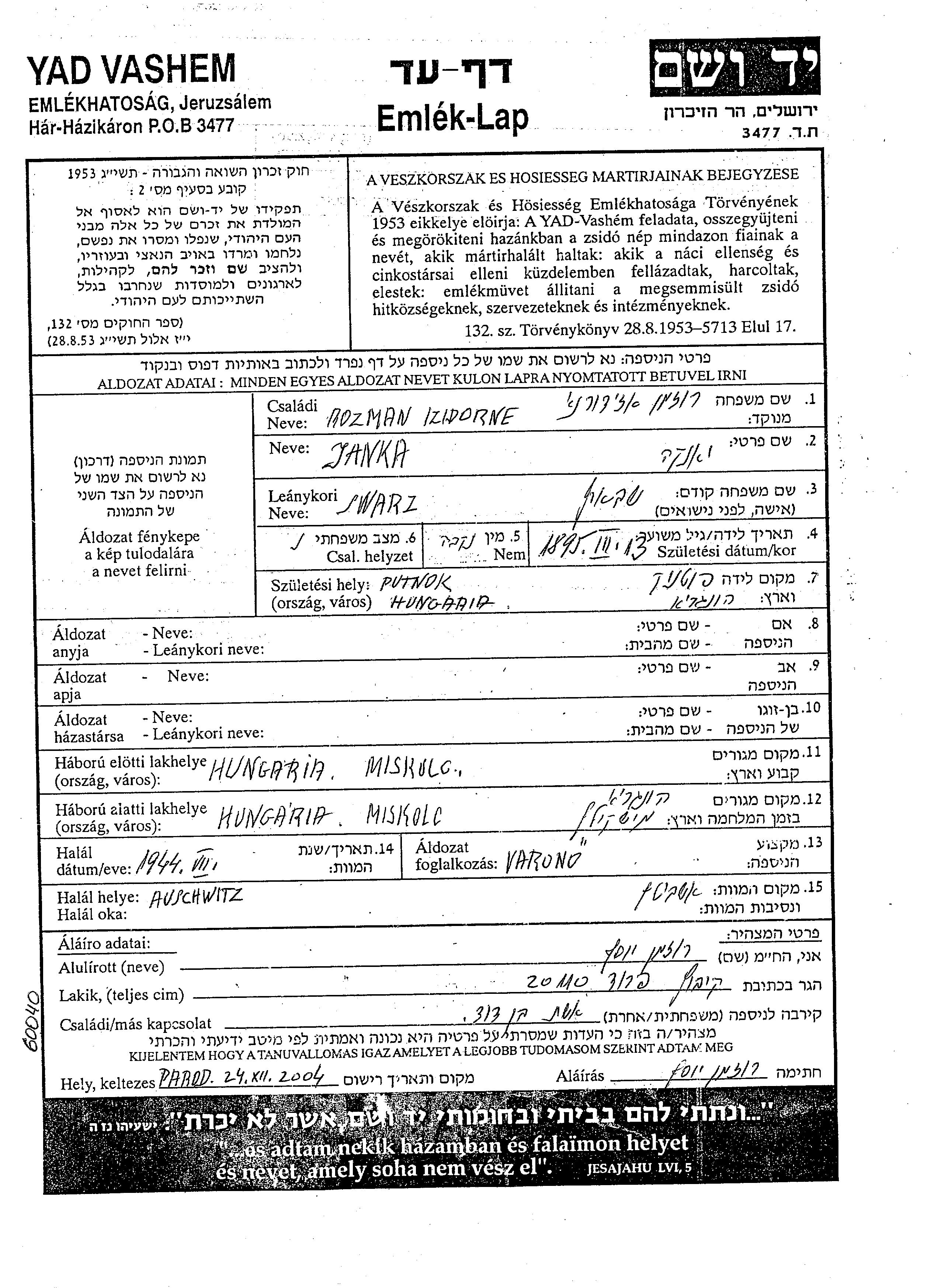 Rozman Janka 1895 Miskolc, Hongrie Feuille de témoignage
