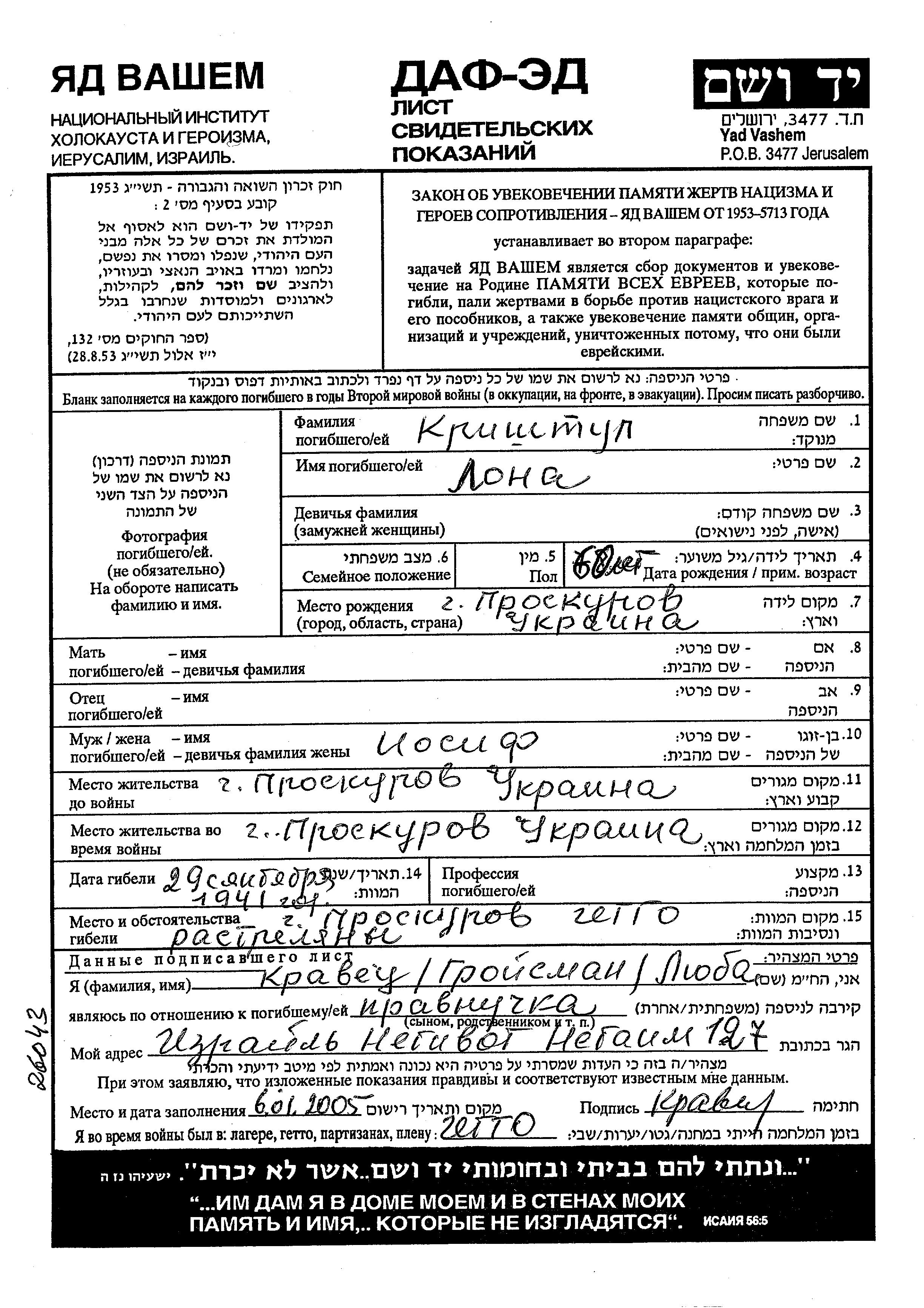 Krishtul Lona Proskurov, Ukraine (URSS) Feuille de témoignage