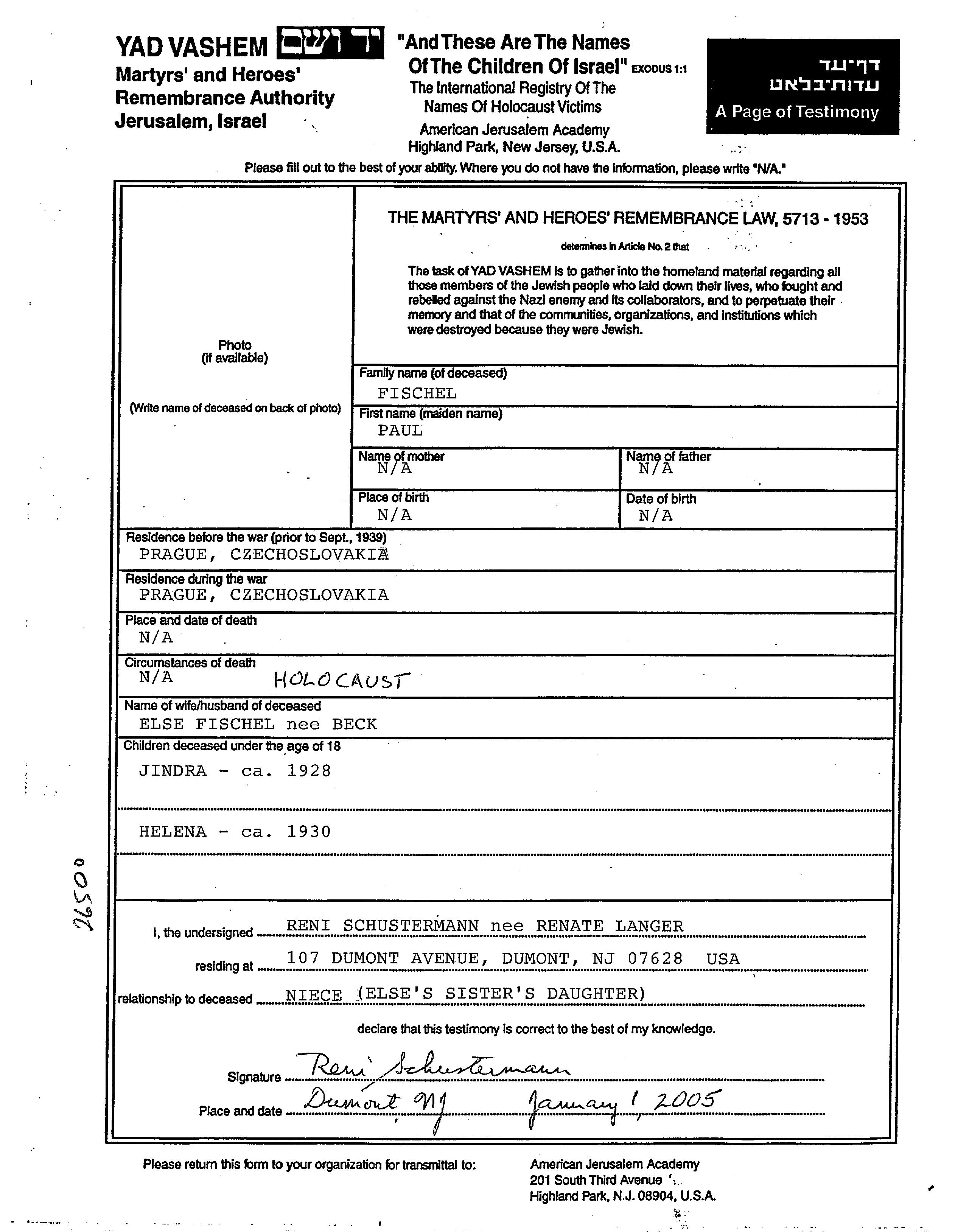 Fischel Paul Prague, Tchécoslovaquie Feuille de témoignage