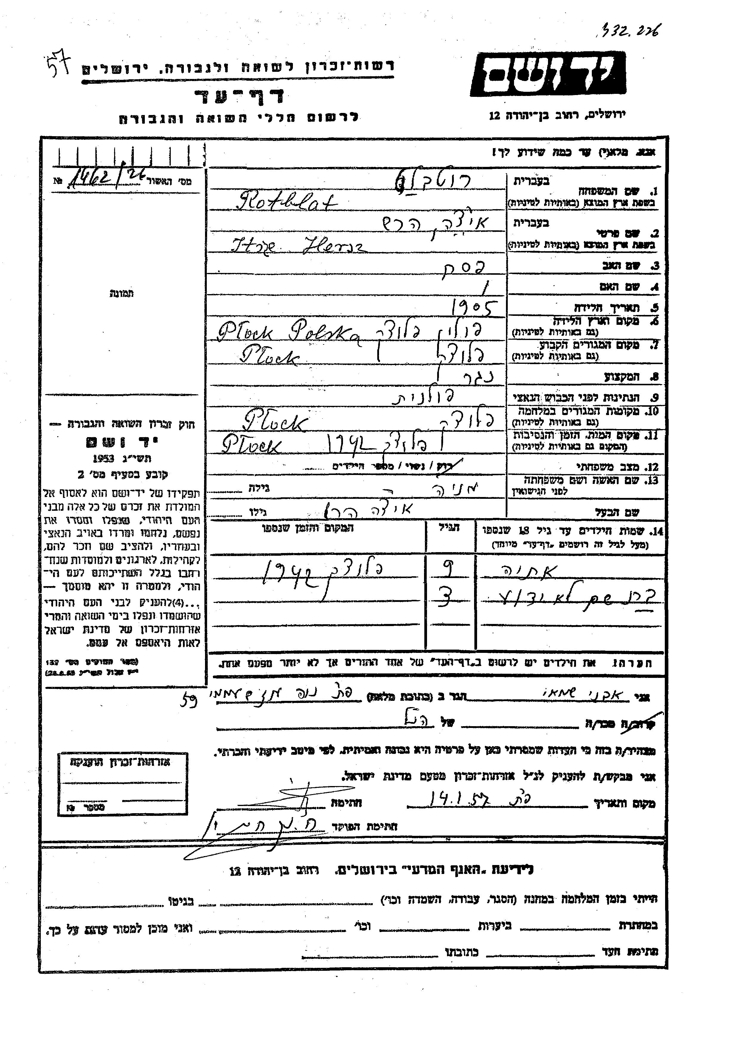 Rotblat Itsze Hersz 1905 Plock, Pologne Feuille de témoignage